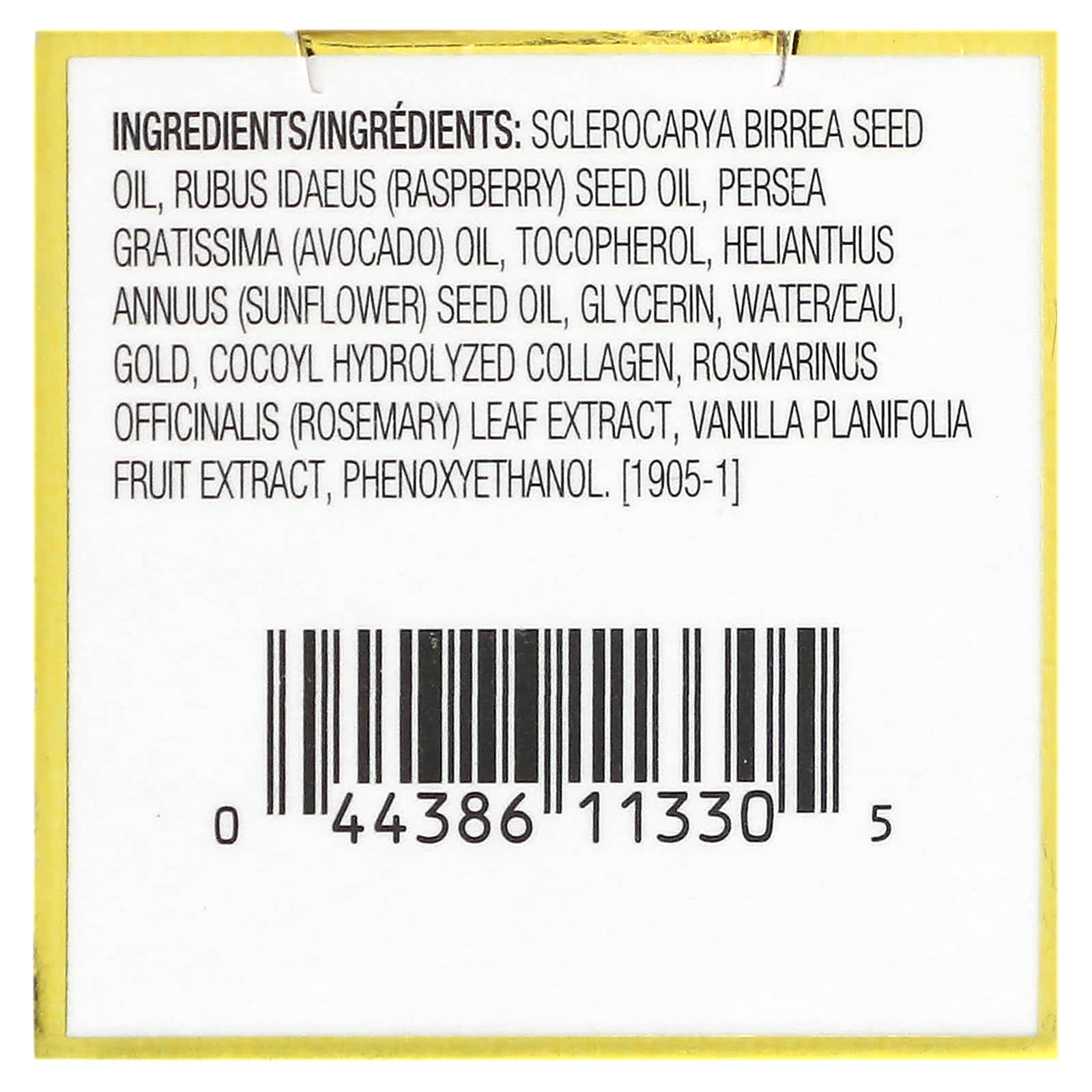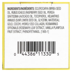 Óleo da semente de Sclerocarya birrea, óleo de semente de rubus idaeus (framboesa), óleo de Persea gratissima (abacate), tocoferol, óleo da semente de Helianthus annuus (girassol), glicerina, água/eau, ouro, colágeno hidrolisado de coco, extrato da folha de Rosmarinus officinalis (alecrim), extrato da fruta de Vanilla planifolia, fenoxietanol.