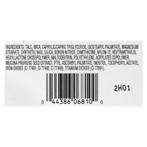Talco, mica, caprylic/capric triglyceride, isostearyl palmitate, estearato de magnésio, cera sintética, sílica, nitreto de boro, dimeticona, náilon-12, hdi/trimethylol hexyllactone crosspolymer, maltodextrina, polietileno, acrylates copolymer, extrato da semente de mucuna pruriens, ptfe, palmitato de ascorbila, inositol, acetato de tocoferol, óxidos de ferro (CI 77491, CI 77492, CI 77499), dióxido de titânio (ci 77891).