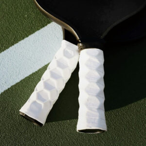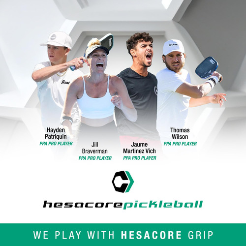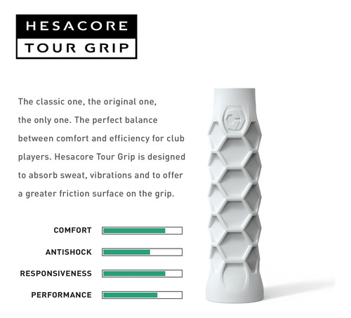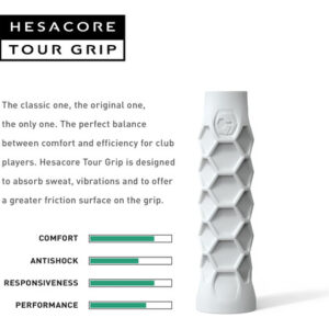 Alça de remo Hesacore Pickleball – 5,25 polegadas – Suporta o cotovelo de tenista, melhora a força de preensão, reduz a vibração com o apoio dos dedos e antisuor – Média – Equilíbrio perfeito entre conforto e eficiência: o design multifacetado da Hesacore expande a superfície de contato entre a mão e a alça. Como resultado, o Hesacore gera entre 8% e 14% a mais de aderência, dependendo da aderência excessiva usada pelo jogador. Isso significa que o jogador pode segurar a alça com menos esforço e contração do dedo, enquanto a mão não escorrega da mão. – Aumenta a força de preensão: com o Hesacore, a mão envolve a alça com uma pegada ideal. Cada um de seus hexágonos tem duas bordas paralelas entre si, que coincidem com as articulações interfalângicas do dedo. Duas das outras bordas do mesmo hexágono ficam paralelas ao dedo, apoiando-o lateralmente. – Mais atrito e suporte para os dedos, aumentando o controle, a potência e a rotação: o Hesacore ajuda no uso correto e eficiente dos três dedos inferiores para gerenciar o giro da raquete, com o dedo mindinho representando o ponto de apoio ao redor da raquete, enquanto o indicador e o polegar, por sua vez, são essenciais para controlar e acelerar a rotação da cabeça da raquete. – Ajuda nas mãos suadas, evitando que a raquete escorregue da mão: ao contrário das alças tradicionais, Padel os jogadores que usam o Hesacore apreciam o fato de a alça não escorregar das mãos. – Jogue com menos esforço e contração dos dedos: ao bater na bola, a contração dos músculos das mãos (especialmente dos dedos médio e anular) está diretamente relacionada às contrações que também acontecem no pulso e no antebraço. Toda essa atividade muscular afeta a eficácia do chute, pois um movimento rígido e rasgado impediria a transferência eficiente de energia para a bola.
