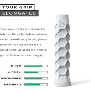 O Hesacore Pickleball Paddle Tour Grip é um punho revolucionário projetado para melhorar o desempenho do jogador, oferecendo conforto incomparável. Essa empunhadura inovadora combina o melhor dos dois mundos, oferecendo um equilíbrio excepcional entre conforto e eficiência, e é por isso que se tornou tão popular entre os jogadores de clubes. Uma das características de destaque do Hesacore Tour Grip é seu design multifacetado, que expande a superfície de contato entre a mão e a alça. Esse recurso gera entre 8% e 14% a mais de aderência, dependendo da aderência excessiva usada pelo jogador, reduzindo o esforço e a contração dos dedos necessários para segurar a alça e, ao mesmo tempo, evitando que a mão escorregue. Outra vantagem exclusiva do Hesacore é sua capacidade de aumentar a força de preensão. Cada hexágono na alça tem duas bordas paralelas uma à outra, coincidindo com as articulações interfalângicas do dedo, fornecendo suporte adicional e reduzindo o movimento lateral. Esse design inovador permite o uso eficiente dos três dedos inferiores para gerenciar o giro da raquete, enquanto o dedo mínimo serve como ponto de apoio em torno do qual a raquete gira. O indicador e o polegar também são essenciais para controlar e acelerar a rotação da cabeça da pá. O Hesacore Tour Grip ajuda a absorver o suor, tornando-o perfeito para jogadores com mãos suadas. As alças tradicionais tendem a escorregar quando as mãos do jogador estão suadas, mas o design exclusivo da Hesacore garante que a raquete não escorregue da mão. Em conclusão, o Hesacore Pickleball Paddle Tour Grip é a melhor aderência para jogadores que desejam melhorar seu desempenho e, ao mesmo tempo, garantir o máximo conforto. Seu design inovador oferece um equilíbrio perfeito entre conforto e eficiência, aumentando a força de preensão, fornecendo mais atrito e apoio para os dedos, absorvendo o suor e reduzindo o esforço e a contração dos dedos necessários para segurar a alça. O Hesacore Tour Grip rapidamente se tornou a escolha preferida entre os jogadores do clube! – Equilíbrio perfeito entre conforto e eficiência: o design multifacetado do Hesacore expande a superfície de contato entre a mão e a alça. Como resultado, o Hesacore gera entre 8% e 14% a mais de aderência, dependendo da aderência excessiva usada pelo jogador. Isso significa que o jogador pode segurar a alça com menos esforço e contração do dedo, enquanto a mão não escorrega da mão. – Aumenta a força de preensão: com o Hesacore, a mão envolve a alça com uma pegada ideal. Cada um de seus hexágonos tem duas bordas paralelas entre si, que coincidem com as articulações interfalângicas do dedo. Duas das outras bordas do mesmo hexágono ficam paralelas ao dedo, apoiando-o lateralmente. – Mais atrito e suporte para os dedos, aumentando o controle, a potência e a rotação: o Hesacore ajuda no uso correto e eficiente dos três dedos inferiores para gerenciar o giro da raquete, com o dedo mindinho representando o ponto de apoio ao redor da raquete, enquanto o indicador e o polegar, por sua vez, são essenciais para controlar e acelerar a rotação da cabeça da raquete. – Ajuda nas mãos suadas, evitando que a raquete escorregue da mão: ao contrário das alças tradicionais, Os jogadores de pickleball que usam o Hesacore apreciam o fato de a alça não escorregar das mãos. – Jogue com menos esforço e contração dos dedos: ao bater na bola, a contração dos músculos das mãos (especialmente dos dedos médio e anular) está diretamente relacionada às contrações que também acontecem no pulso e no antebraço. Toda essa atividade muscular afeta a eficácia do chute, pois um movimento rígido e rasgado impediria a transferência eficiente de energia para a bola.