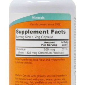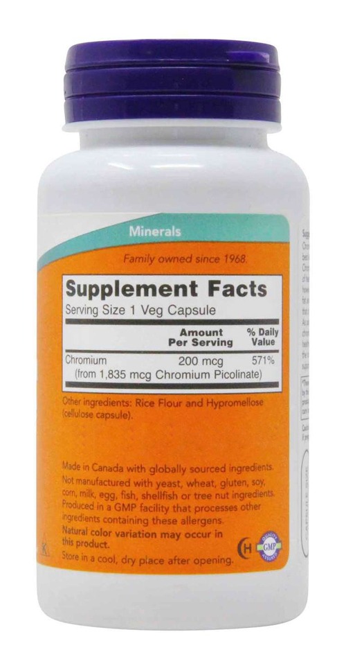 Picolinato de Cromo 200mcg Now foods 100 Capsulas Vegetarianas / No Brasil   O Picolinato de Cromo é um mineral essencial que é mais conhecido por seu papel como co-fator de insulina, sendo portanto, essencial para a manutenção do bem-estar do metabolismo da glicose e dos carboidratos, é importante para a utilização de gordura e proteína. Nesta formular de 200mcg da Now Foods você pode contar com as quantidades necessárias desta substância para complementar facilmente sua dieta alimentar, a partir de cápsulas de softgels que podem ser rapidamente absorvidas pelo organismo, apenas uma cápsula por dia junto a uma refeição é tudo que você precisa!   Outros Ingredientes: Outros Ingredientes: Farinha de Arroz e Hipromelose (cápsula de celulose).   Fabricado sem fermento trigo, glúten, soja, milho, leite, ovo, peixe, marisco ou nozes.   Recomendações de uso: Tome 1 cápsula ao dia com uma refeição   Cuidados: Apenas para adultos. Pode ocorrer variação de cor natural neste produto. Mantenha fora do alcance de crianças.   Armazenamento: Armazenar em local fresco e seco após a abertura.   Dimensões: 6,6 x 6,6 x 11,3 cm Peso: 0,178   1x Frasco com 500 softgels   Vide Validade
