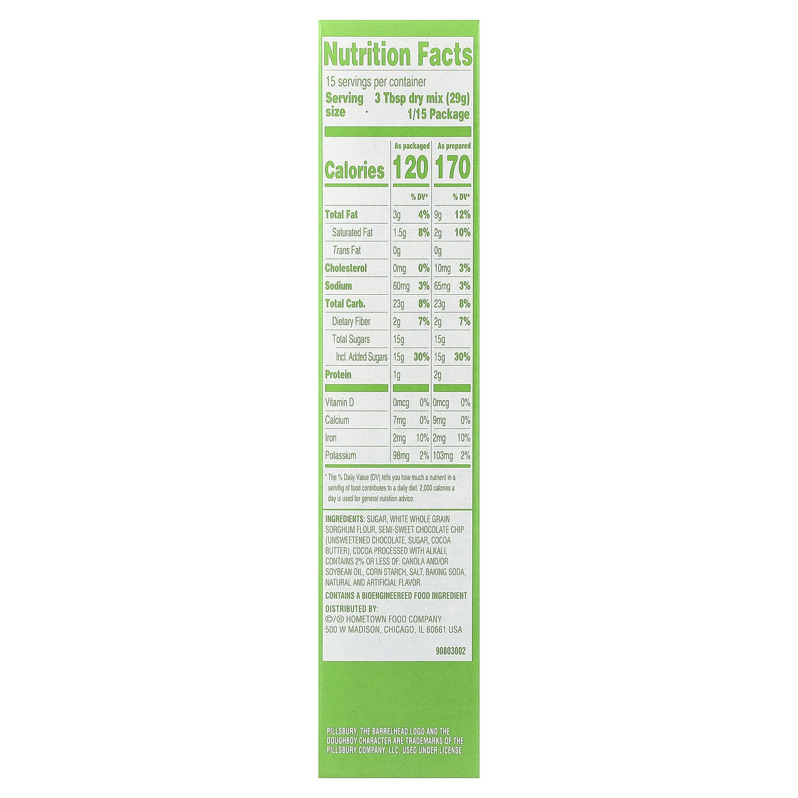 Açúcar, farinha de sorgo branco de grãos integrais, gotas de chocolate semidoces (chocolate sem açúcar, açúcar, manteiga de cacau), Cacau processado com álcali, contém 2% ou menos de: óleo de canola, amido de milho, sal, bicarbonato de sódio, sabor natural e artificial.
