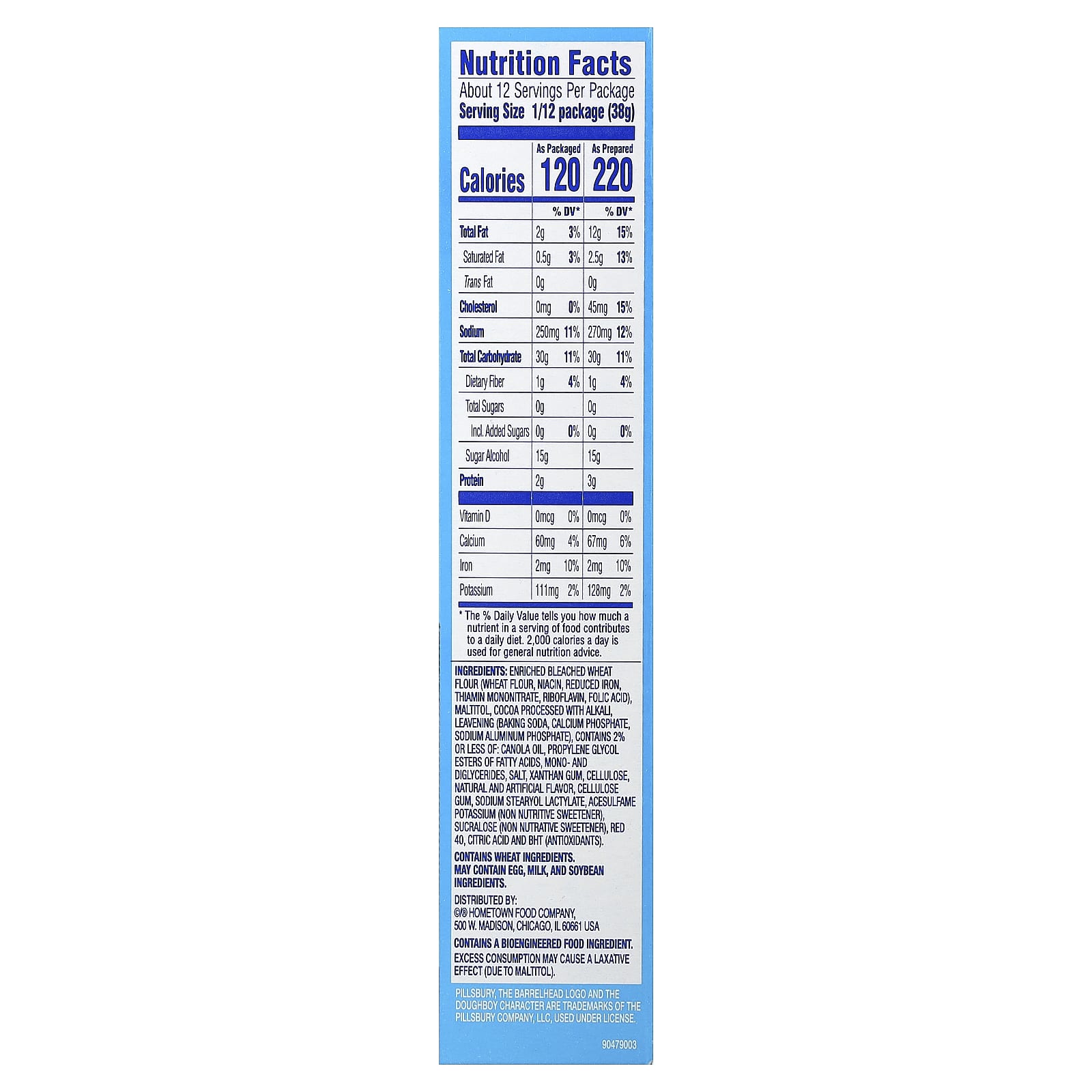 Farinha de trigo branqueada enriquecida (farinha de trigo), ácido nicotínico, ferro reduzido, mononitrato de tiamina, riboflavina, ácido fólico), maltitol, cacau processado com álcali, fermentação (bicarbonato de sódio, fosfato de cálcio, fosfato de sódio e alumínio), contém 2% ou menos de: óleo de canola, ésteres de propilenoglicol de ácidos graxos, monoglicerídeos e diglicerídeos, sal, goma xantana, celulose, sabores naturais e artificiais, goma de celulose, estearil lactato de sódio, acessulfame de potássio (adoçante não nutritivo), sucralose (adoçante não nutritivo), vermelho 40, ácido cítrico e bht (antioxidantes).
