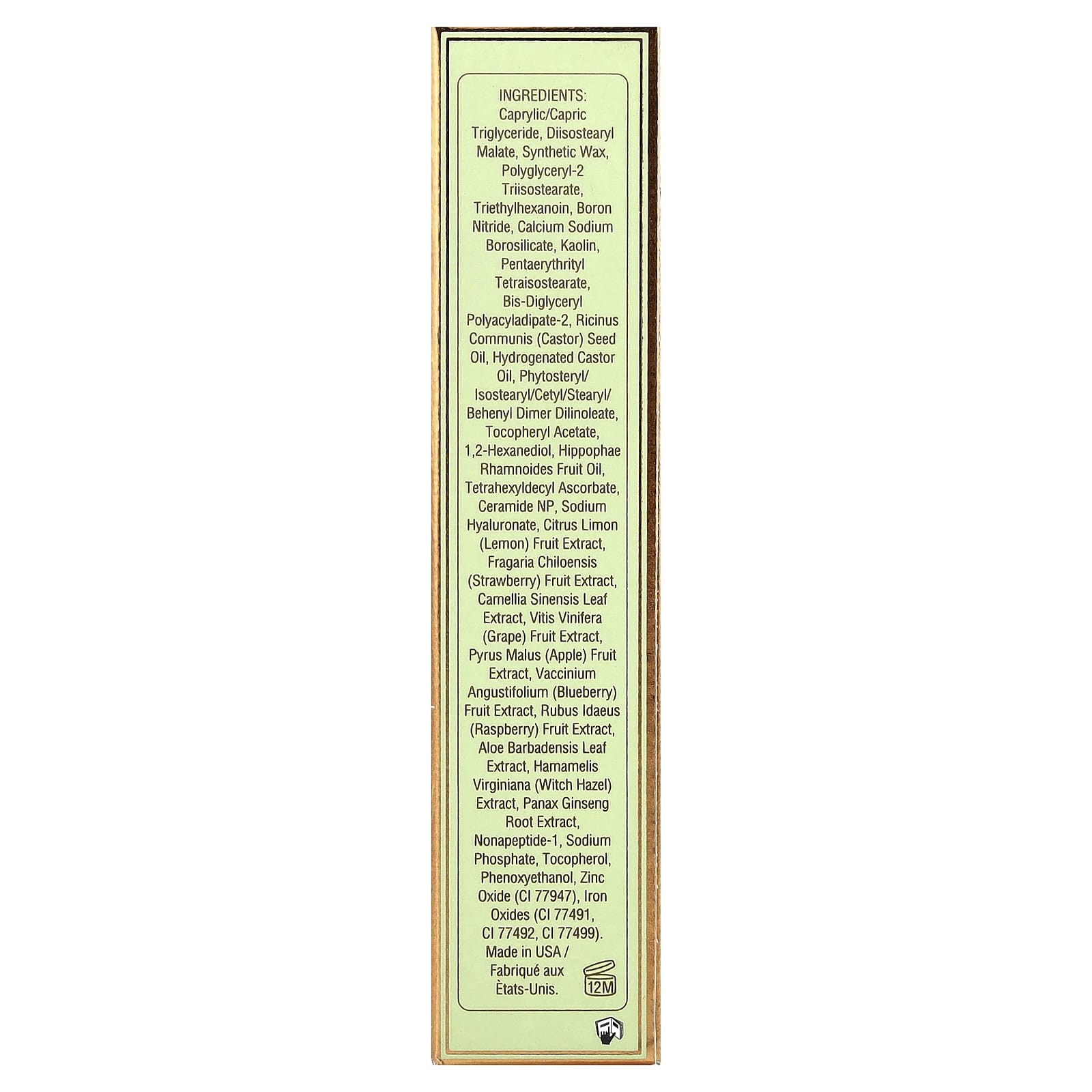 Caprylic/capric triglyceride, diisostearyl malate, cera sintética, polyglyceryl-2 triisostearate, triethylhexanoin, nitreto de boro, calcium sodium borosilicate, caulim, pentaerythrityl tetraisostearate, bis-diglyceryl polyacyladipate-2, óleo da semente de Ricinus communis (rícino), óleo de rícino hidrogenado, fitoesterol/isoestearílico/cetil/estearil/behenyl dimer dilinoleate, acetato de tocoferol, 1,2-hexanediol, óleo da fruta de Hippophae rhamnoides, tetrahexidecil ascorbato, ceramida NP, hialuronato de sódio, extrato da fruta Citrus limon (limão-siciliano), extrato da fruta de Fragaria chiloensis (morango), extrato da folha de Camellia sinensis, extrato da fruta de Vitis vinifera (uva), extrato da fruta de Pyrus malus (maçã), extrato da fruta de Vaccinium angustifolium (mirtilo), extrato da fruta de Rubus idaeus (framboesa), extrato da folha de Aloe barbadensis, extrato de Hamamelis virginiana (hamamélis), extrato da raiz de Panax ginseng, nonapeptídeo-1, fosfato de sódio, tocoferol, fenoxietanol, óxido de zinco (CI 77947), óxidos de ferro (CI 77491, ci 77492, CI 77499).