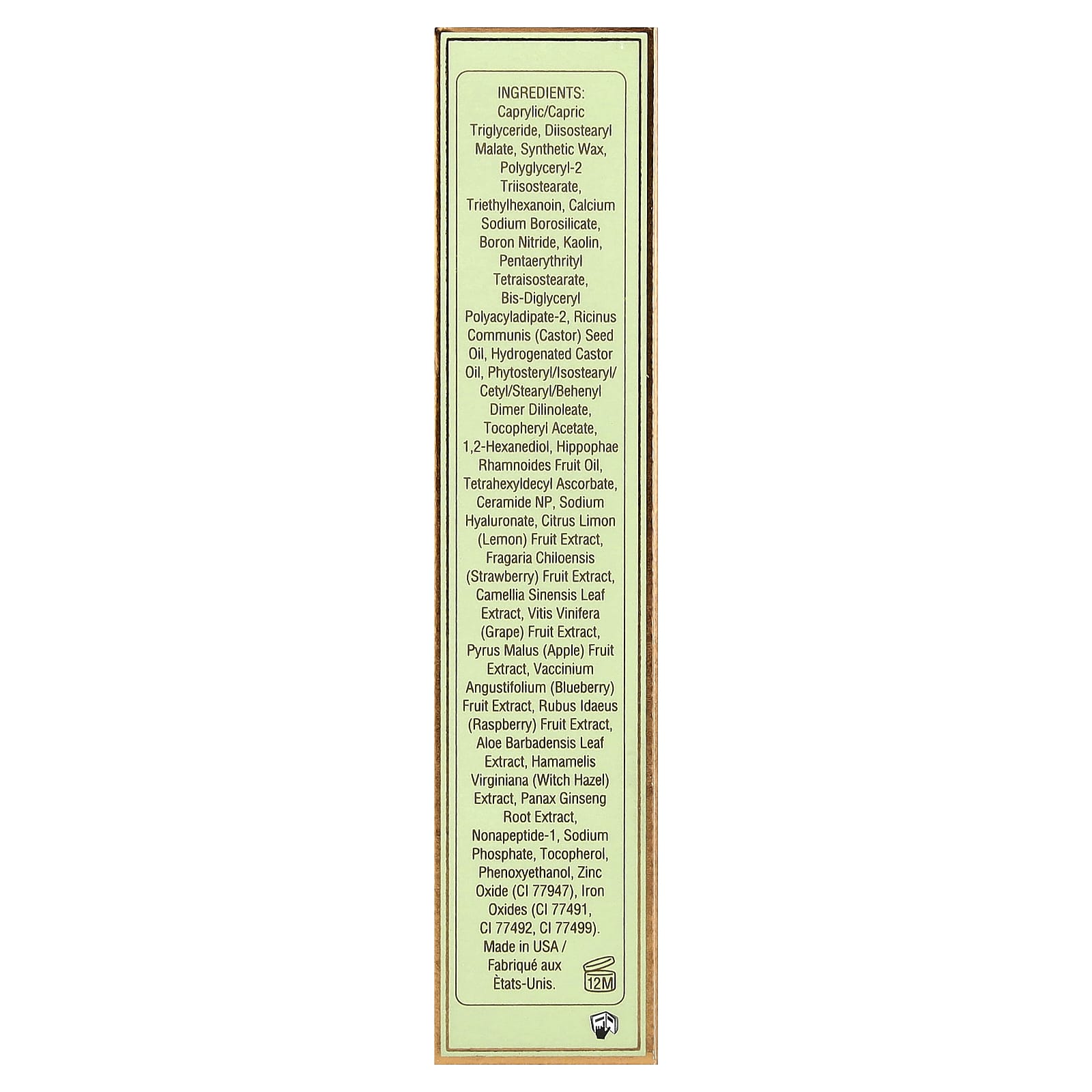 Caprylic/capric triglyceride, diisostearyl malate, cera sintética, polyglyceryl-2 triisostearate, triethylhexanoin, calcium sodium borosilicate, nitreto de boro, caulim, pentaerythrityl tetraisostearate, bis-diglyceryl polyacyladipate-2, óleo da semente de Ricinus communis (rícino), óleo de rícino hidrogenado, Phytosteryl/isostearyl/cetyl/stearyl/behenyl dimer dilinoleate, acetato de tocoferol, 1,2-hexanediol, óleo da fruta de Hippophae rhamnoides, tetrahexidecil ascorbato, ceramida NP, hialuronato de sódio, extrato da fruta Citrus limon (limão-siciliano), extrato da fruta de Fragaria chiloensis (morango), extrato da folha de Camellia sinensis, extrato da fruta de Vitis vinifera (uva), extrato da fruta de Pyrus malus (maçã), extrato da fruta de Vaccinium angustifolium (mirtilo), extrato da fruta de Rubus idaeus (framboesa), extrato da folha de Aloe barbadensis, extrato de Hamamelis virginiana (hamamélis), extrato da raiz de Panax ginseng, nonapeptídeo-1, fosfato de sódio, tocoferol, fenoxietanol, óxido de zinco (CI 77947), óxidos de ferro (CI 77491, ci 77492, CI 77499).