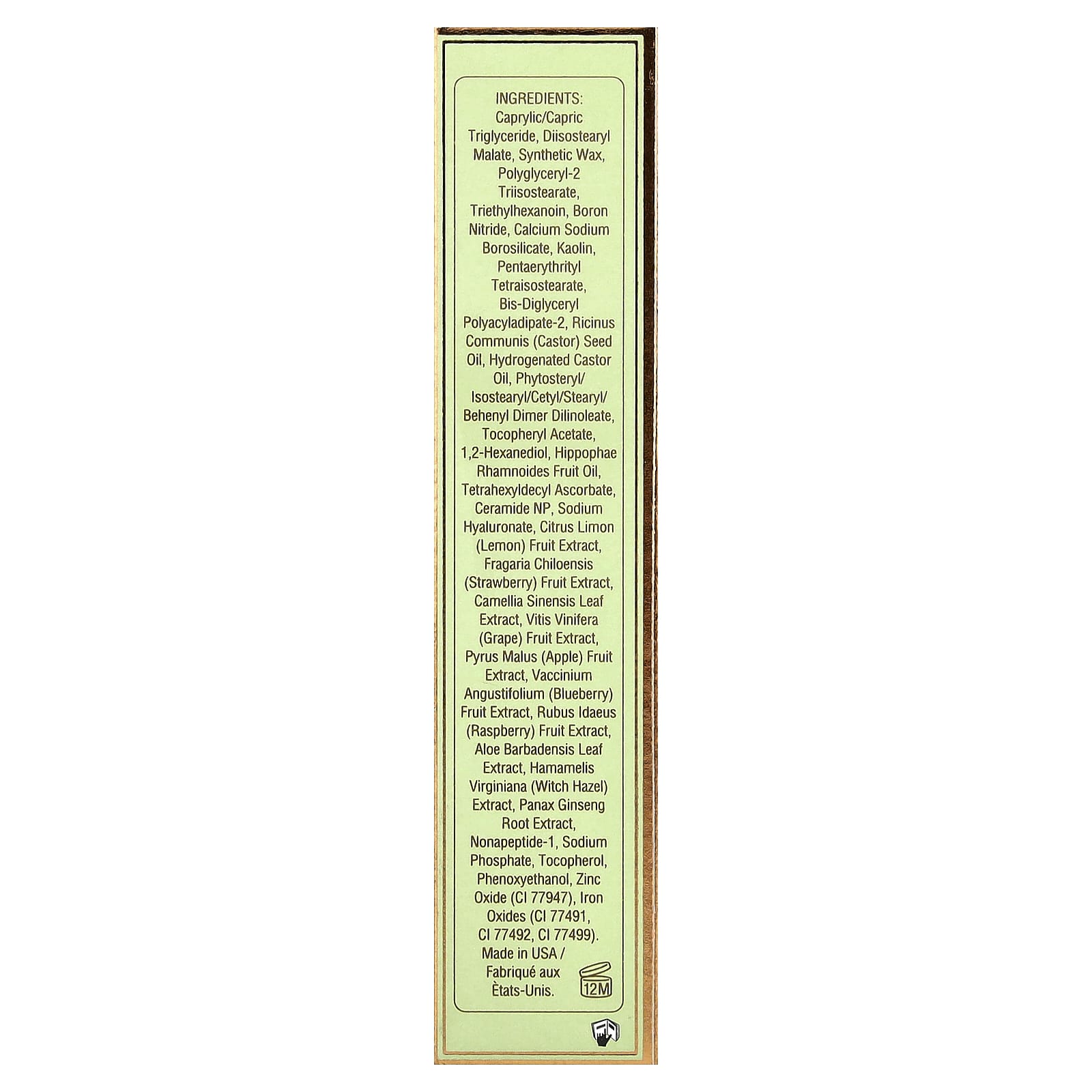 Caprylic/capric triglyceride, diisostearyl malate, cera sintética, polyglyceryl-2 triisostearate, triethylhexanoin, nitreto de boro, calcium sodium borosilicate, caulim, pentaerythrityl tetraisostearate, bis-diglyceryl polyacyladipate-2, óleo da semente de Ricinus communis (rícino), óleo de rícino hidrogenado, fitoesterol/isoestearílico/cetil/estearil/behenyl dimer dilinoleate, acetato de tocoferol, 1,2-hexanediol, óleo da fruta de Hippophae rhamnoides, tetrahexidecil ascorbato, ceramida NP, hialuronato de sódio, extrato da fruta Citrus limon (limão-siciliano), extrato da fruta de Fragaria chiloensis (morango), extrato da folha de Camellia sinensis, extrato da fruta de Vitis vinifera (uva), extrato da fruta de Pyrus malus (maçã), extrato da fruta de Vaccinium angustifolium (mirtilo), extrato da fruta de Rubus idaeus (framboesa), extrato da folha de Aloe barbadensis, extrato de Hamamelis virginiana (hamamélis), extrato da raiz de Panax ginseng, nonapeptídeo-1, fosfato de sódio, tocoferol, fenoxietanol, óxido de zinco (CI 77947), óxidos de ferro (CI 77491, ci 77492, CI 77499).