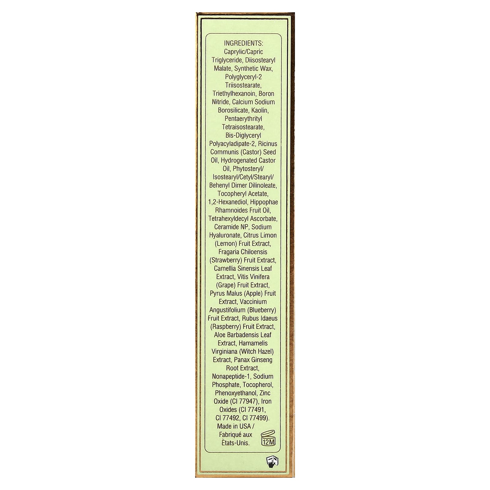 Caprylic/capric triglyceride, diisostearyl malate, cera sintética, polyglyceryl-2 triisostearate, triethylhexanoin, nitreto de boro, calcium sodium borosilicate, caulim, pentaerythrityl tetraisostearate, bis-diglyceryl polyacyladipate-2, óleo da semente de Ricinus communis (rícino), óleo de rícino hidrogenado, fitoesterol/isoestearílico/cetil/estearil/behenyl dimer dilinoleate, acetato de tocoferol, 1,2-hexanediol, óleo da fruta de Hippophae rhamnoides, tetrahexidecil ascorbato, ceramida NP, hialuronato de sódio, extrato da fruta Citrus limon (limão-siciliano), extrato da fruta de Fragaria chiloensis (morango), extrato da folha de Camellia sinensis, extrato da fruta de Vitis vinifera (uva), extrato da fruta de Pyrus malus (maçã), extrato da fruta de Vaccinium angustifolium (mirtilo), extrato da fruta de Rubus idaeus (framboesa), extrato da folha de Aloe barbadensis, extrato de Hamamelis virginiana (hamamélis), extrato da raiz de Panax ginseng, nonapeptídeo-1, fosfato de sódio, tocoferol, fenoxietanol, óxido de zinco (CI 77947), óxidos de ferro (CI 77491, ci 77492, CI 77499).