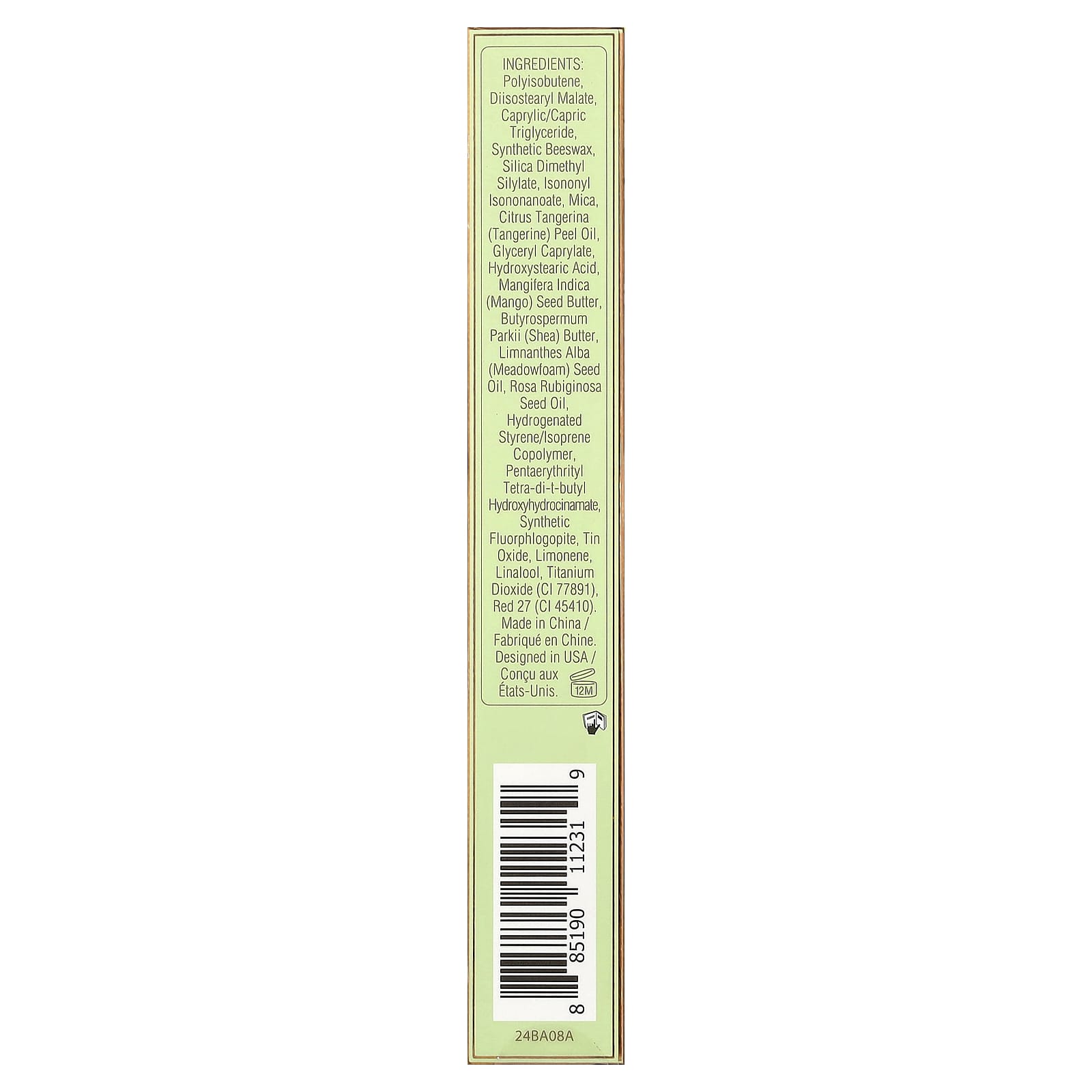 Poli-isobutileno, diisostearyl malate, caprylic/capric triglyceride, cera de abelha sintética, silica dimethyl silylate, isononyl isononanoate, mica, óleo da casca de Citrus tangerina (tangerina), caprilato de glicerila, ácido hidroxiesteárico, manteiga da semente de Mangifera indica (manga), manteiga de Butyrospermum parkii (karité), óleo da semente de Limnanthes alba (meadowfoam), óleo da semente de Rosa rubiginosa, hydrogenated styrene/isoprene copolymer, pentaeritritol tetra-di-t-butil hidroxihidrocinamate, synthetic fluorphlogopite, óxido de estanho, limoneno, linalol, dióxido de titânio (CI 77891), vermelho 27 (CI 45410).