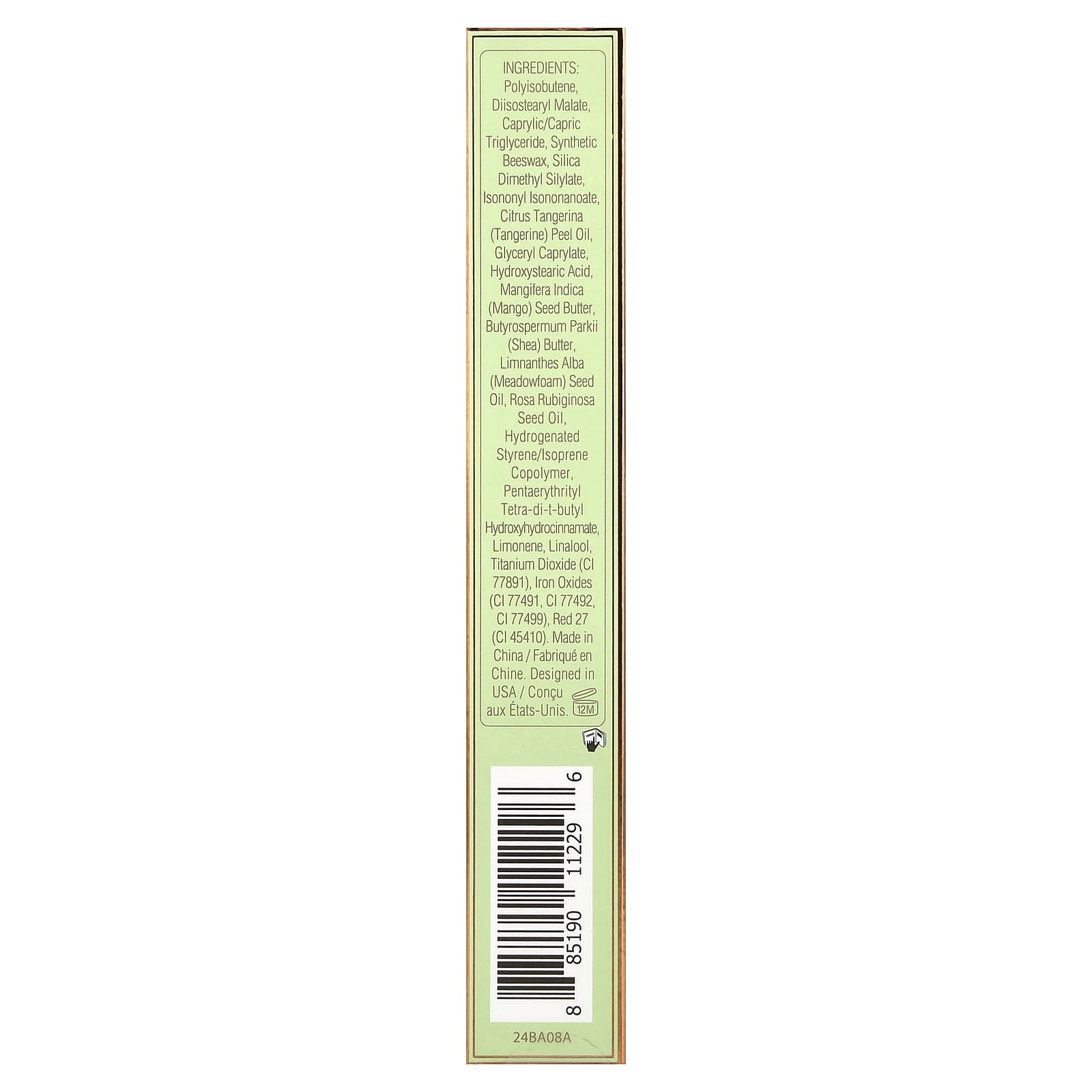 Poli-isobutileno, diisostearyl malate, caprylic/capric triglyceride, cera de abelha sintética, silica dimethyl silylate, isononyl isononanoate, óleo da casca de Citrus tangerina (tangerina), caprilato de glicerila, ácido hidroxiesteárico, manteiga da semente de Mangifera indica (manga), manteiga de Butyrospermum parkii (karité), óleo da semente de Limnanthes alba (meadowfoam), óleo da semente de Rosa rubiginosa, hydrogenated styrene/isoprene copolymer, pentaerythrityl tetra-di-t-butyl hydroxyhydrocinnamate, limoneno, linalol, dióxido de titânio (CI 77891), óxidos de ferro (CI 77491, CI 77492, CI 77499), vermelho 27 (CI 45410).