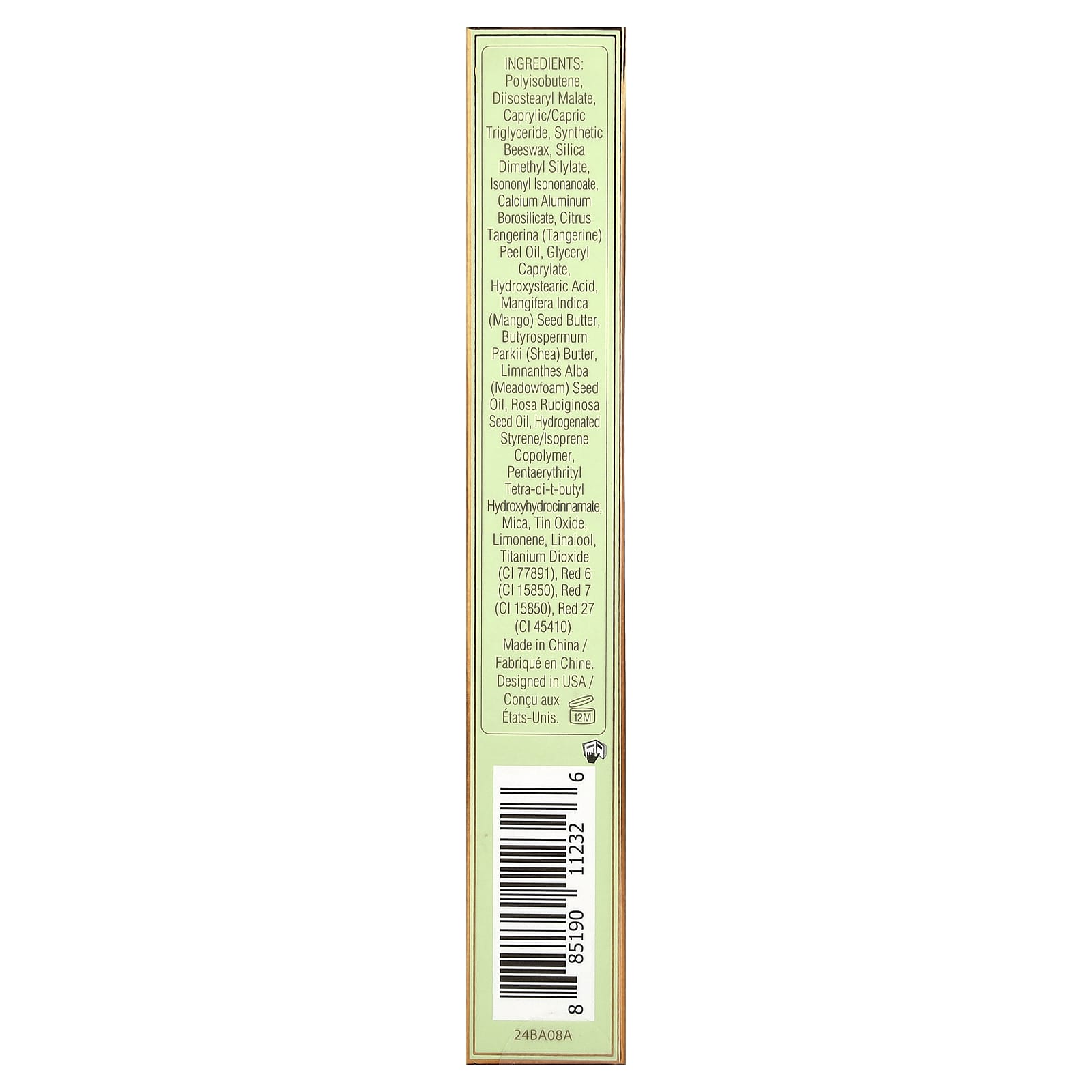Poli-isobutileno, diisostearyl malate, caprylic/capric triglyceride, cera de abelha sintética, silica dimethyl silylate, isononyl isononanoate, calcium aluminum borosilicate, óleo da casca de Citrus tangerina (tangerina), caprilato de glicerila, ácido hidroxiesteárico, manteiga da semente de Mangifera indica (manga), manteiga de Butyrospermum parkii (karité), óleo da semente de Limnanthes alba (meadowfoam), óleo da semente de Rosa rubiginosa, hydrogenated styrene/isoprene copolymer, pentaerythrityl tetra-di-t-butyl hydroxyhydrocinnamate, mica, óxido de estanho, limoneno, linalol, dióxido de titânio (CI 77891), vermelho rubi (CI 15850), vermelho 7 (CI 15850), vermelho 27 (CI 45410)