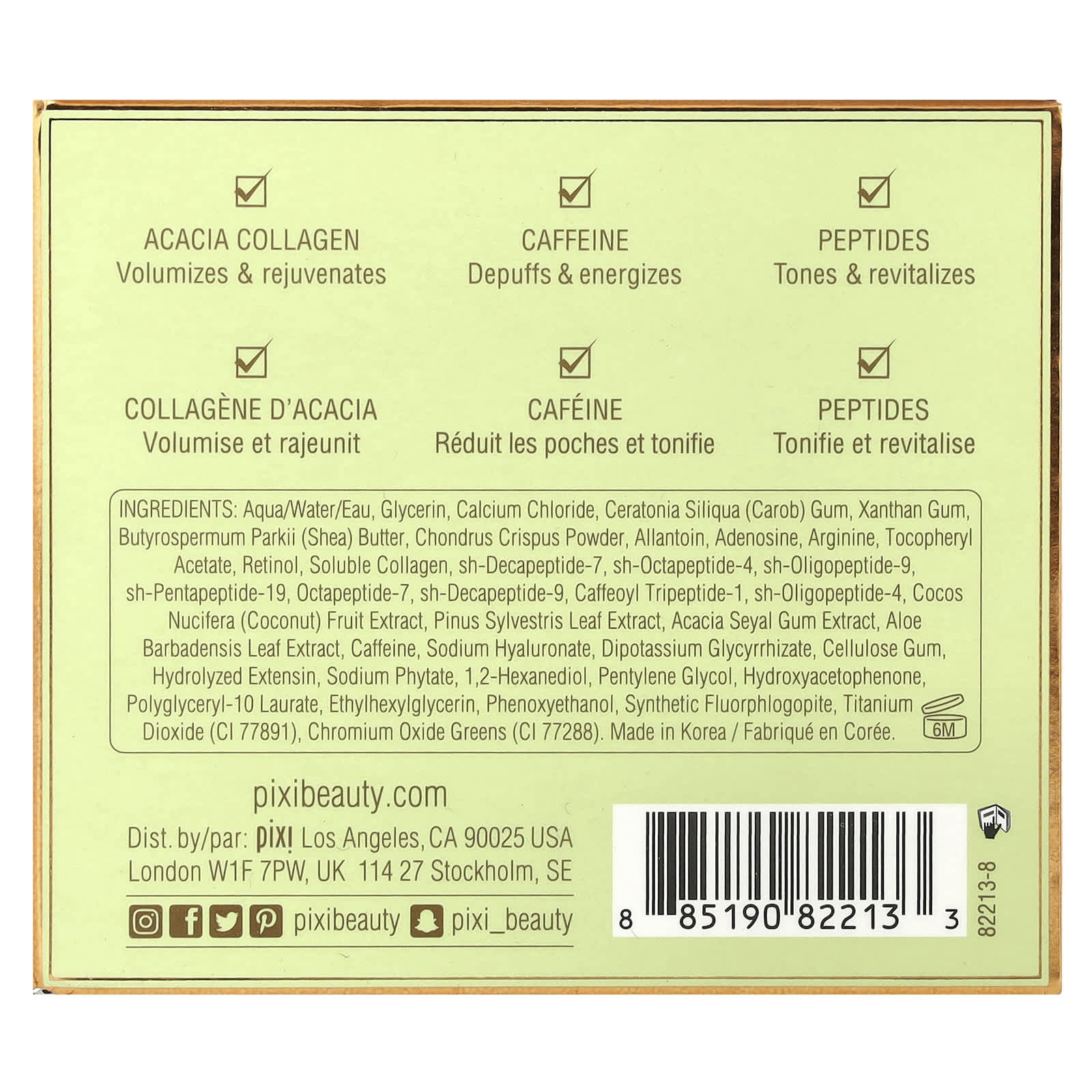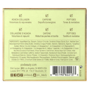 Água/aqua/eau, glicerina, cloreto de cálcio, goma de Ceratonia siliqua (alfarroba), goma xantana, manteiga de Butyrospermum parkii (karité), pó de Chondrus crispus, alantoína, adenosina, arginina, acetato de tocoferol, retinol, colágeno solúvel, sh-decapeptide-7, sh-octapeptide-4, sh-oligopeptide-9, sh-pentapeptide-19, octapeptide-7, sh-decapeptide-9, caffeoyl tripeptide-1, sh-oligopeptídeo-4, extrato da fruta de Cocos nucifera (coco), extrato da folha de Pinus sylvestris, extrato da goma de acácia seyal, extrato da folha de Aloe barbadensis, cafeína, hialuronato de sódio, dipotassium glycyrrhizate, goma de celulose, extensina hidrolisada, fitato de sódio, 1,2-hexanediol, pentilenoglicol, hydroxyacetophenone, polyglyceryl-10 laurate, ethylhexylglycerin, fenoxietanol, synthetic fluorphlogopite, dióxido de titânio (CI 77891), verdes de óxido de cromo (CI 77288).