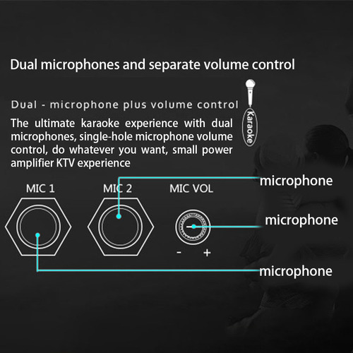 Entrada dupla de microfone, reverberação ajustável; receptor sem fio embutido e rádio FM.