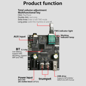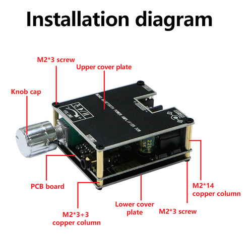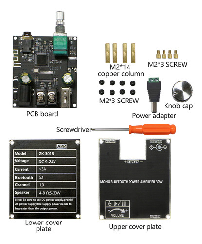DC9-24 volts, 3A (não pode ser conectado à alimentação CA) Alto-falante adaptado: 4-8, 5-30 W Tamanho do item: 71 * 47 * 21 mm/2,8 * 1,9 * 0,8 pol Peso do item: 50 g/1,8 onças