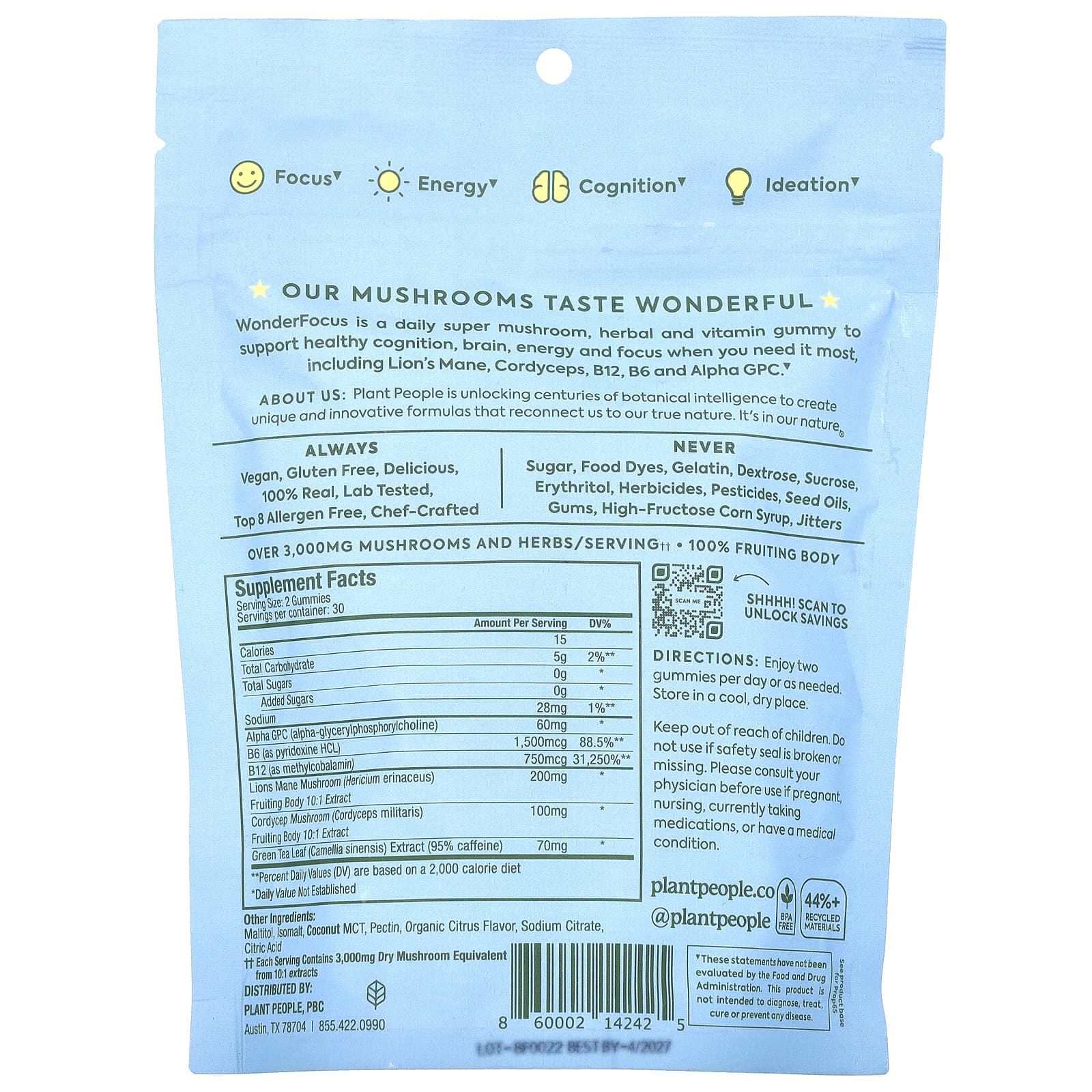Plant People WonderFocus® Gomas de Cogumelos Cítricos Suculentos 60 Gomas – Plant People Suplementos Cérebro e Cognição Fórmulas para Foco e Memória Cogumelos.