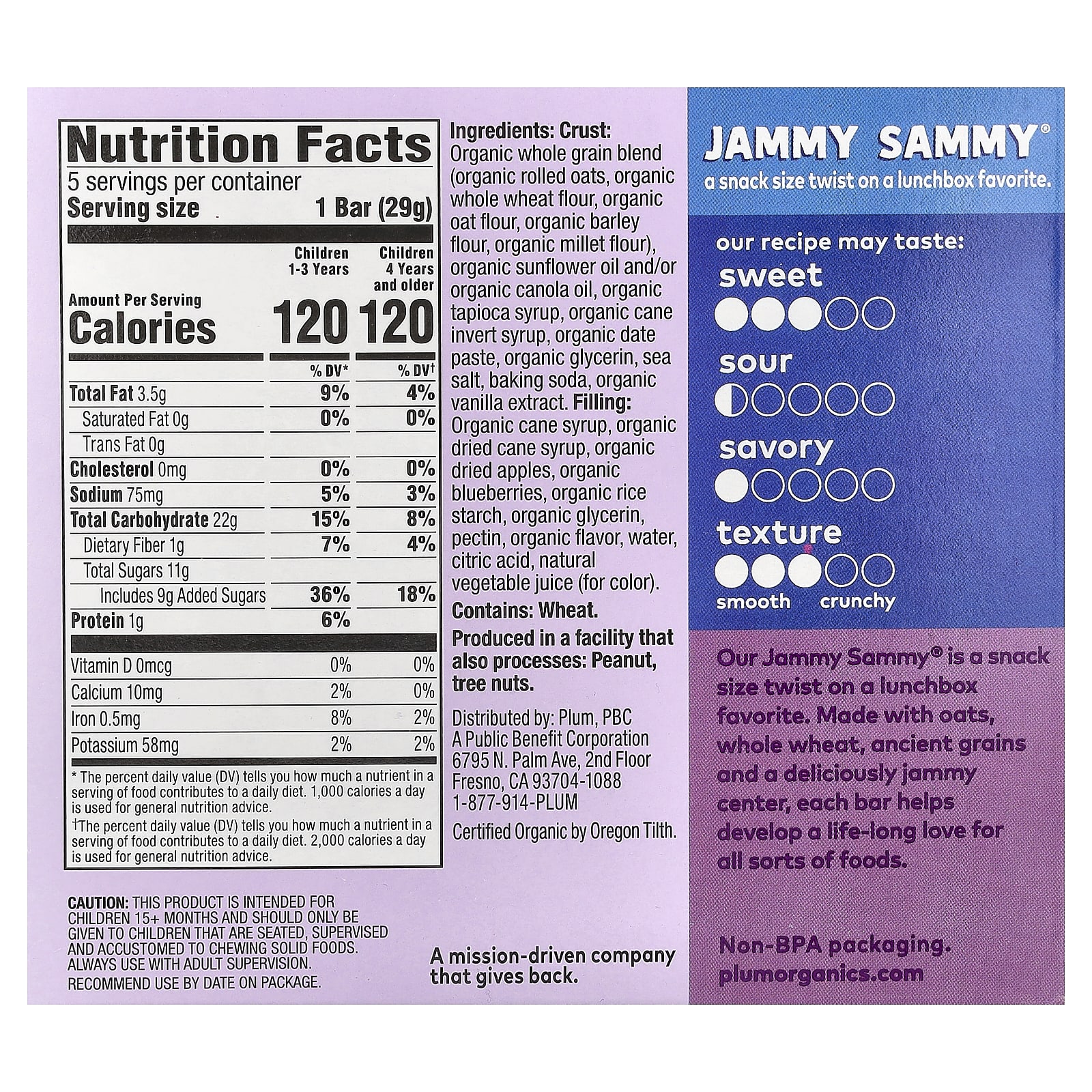 Plum Organics Jammy Sammy® Barra de sanduíche do tamanho de um petisco Mais de 15 meses Mirtilo e Aveia 5 Barras 29 g (102 oz) Cada – Plum Organics Bebês e Crianças Alimentação Lanches para Bebês e Crianças.
