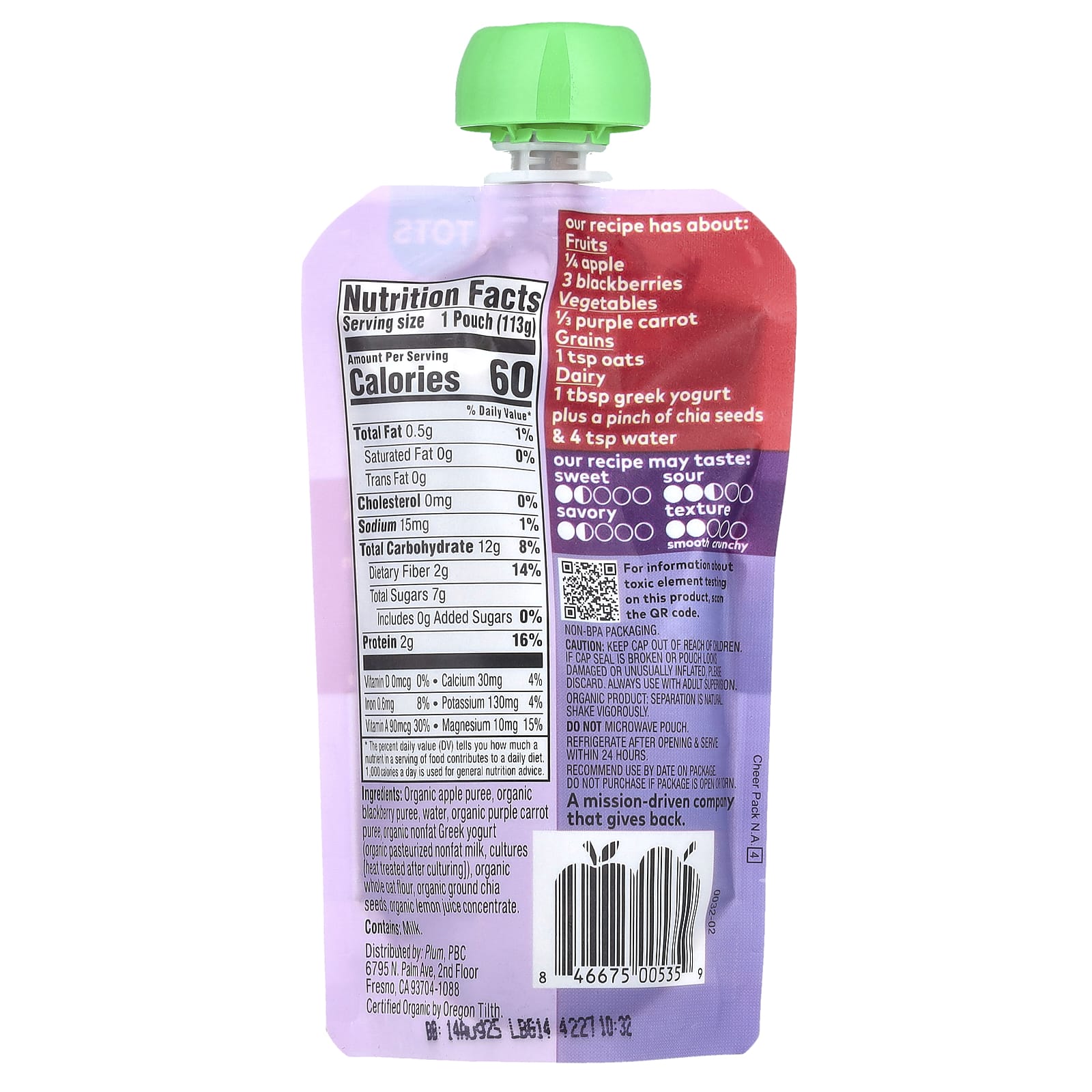 Purê de maçã orgânica, purê de amora orgânica, água, purê de cenoura roxa orgânica, iogurte grego sem gordura orgânico (leite orgânico sem gordura pasteurizado, culturas [tratamento térmico após cultura]), farinha de aveia integral orgânica, sementes de chia orgânica moída, concentrado de suco de limão orgânico.