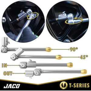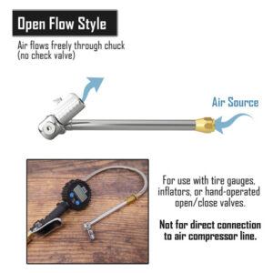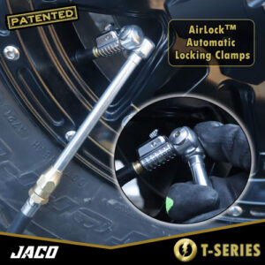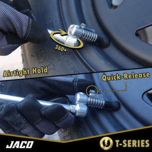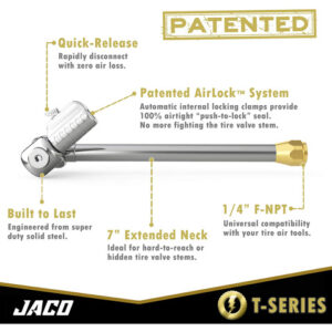 O mandril de ar de pneu duplo Lightning T-Series é um mandril de pneu NPT de 1/4 de polegada que é ideal para a inflação de pneus de caminhão de duas rodas quando usado com um medidor de inflação de pneus em linha e um compressor de ar. Este mandril de ar patenteado se fixa automaticamente na haste da válvula do pneu de seu trailer, caminhão, caminhão semi, motorhome ou qualquer veículo com dois passageiros. Possui uma válvula de desconexão rápida sem perda de ar que se libera rapidamente da haste da válvula do pneu sem perda de ar. Ideal para uso com ferramentas infladoras de pneus que estão diretamente conectadas a um compressor de ar. – VEDAÇÃO HERMÉTICA: O bocal de conexão rápida patenteado e autotravante garante uma vedação rápida e segura – não há mais vazamentos de ar ou brigas com a haste da válvula do pneu. – LIBERAÇÃO RÁPIDA: O botão de liberação rápida patenteado permite a remoção ultrarrápida da haste da válvula do pneu, garantindo a manutenção precisa do pneu sem perda de ar. – FLUXO ABERTO: Destinado ao uso com somente medidores de ferramentas de inflação de pneus lineares. Se o compressor tiver um tanque de ar, você deve primeiro conectar esse mandril a uma ferramenta em linha que aceite acessórios NPT de 1/4 de polegada (NÃO é adequado para conexão direta à mangueira de ar do compressor). Verifique antes de fazer o pedido. – FÁCIL DE USAR: A cabeça giratória dupla de 360 graus gira totalmente em qualquer ângulo, reduzindo a tensão da linha aérea. Possui um gargalo estendido de 7 polegadas para válvulas de pneus de difícil acesso em veículos duplos, caminhões, trailers e muito mais. – CONSTRUÍDO PARA DURAR: projetado com mais de 35 anos de experiência no setor, este mandril de ar é durável e conta com a garantia vitalícia da JACO.