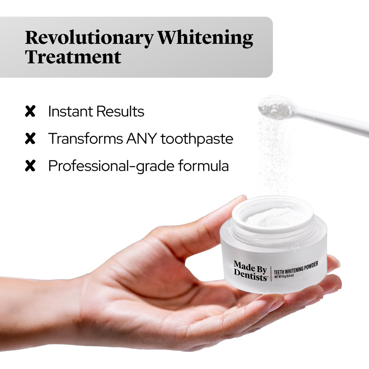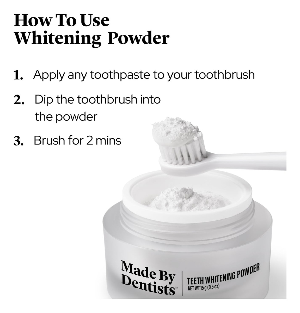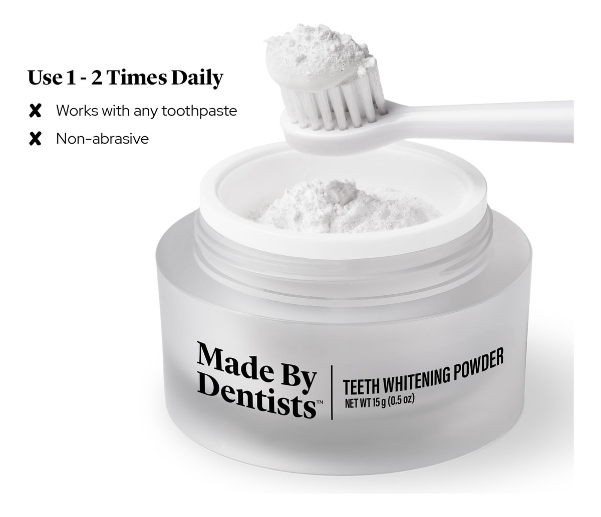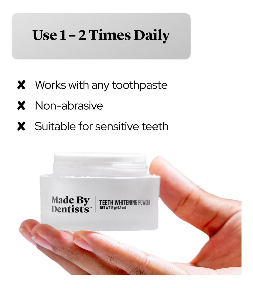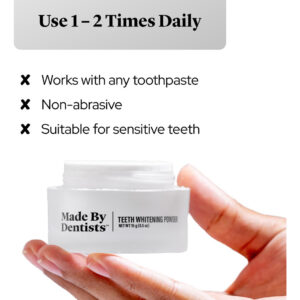 Eleve sua higiene bucal diária com o pó clareador de dentes Made by Dentists, uma fórmula inovadora que transforma qualquer creme dental em um poderoso tratamento clareador. Elaborado profissionalmente com ingredientes ativos, incluindo PAP, hidroxiapatita e pó de diamante, este pó clareador para dentes combate manchas persistentes para proporcionar um sorriso visivelmente mais branco e brilhante. Suave e não abrasivo, foi projetado para uso diário e funciona perfeitamente com sua rotina regular de escovação. Experimente resultados instantâneos de clareamento com um produto que combina ciência e simplicidade – este pó clareador de dentes foi aprovado pelo dentista. – Resultados de clareamento instantâneo: veja um sorriso mais brilhante desde o primeiro uso com este pó dental para clarear dentes, que tem uma fórmula de nível profissional projetada para remover manchas persistentes. – Transforma qualquer pasta de dente: misture este pó de dente clareador com sua pasta de dente favorita para criar um poderoso tratamento de clareamento como parte de sua rotina diária. – Fórmula não abrasiva: suave no esmalte enquanto remove manchas com eficácia, garantindo um clareamento diário seguro e eficaz. – Ingredientes ativos profissionais: este pó dental contém hidroxiapatita, pó de diamante, PAP e peróxido de hidrogênio para remoção direcionada de manchas e brilho duradouro. – Use 1 a 2 vezes ao dia: simples de incorporar à sua rotina de escovação. Basta adicionar à pasta de dente para clarear sem esforço, de manhã ou à noite.