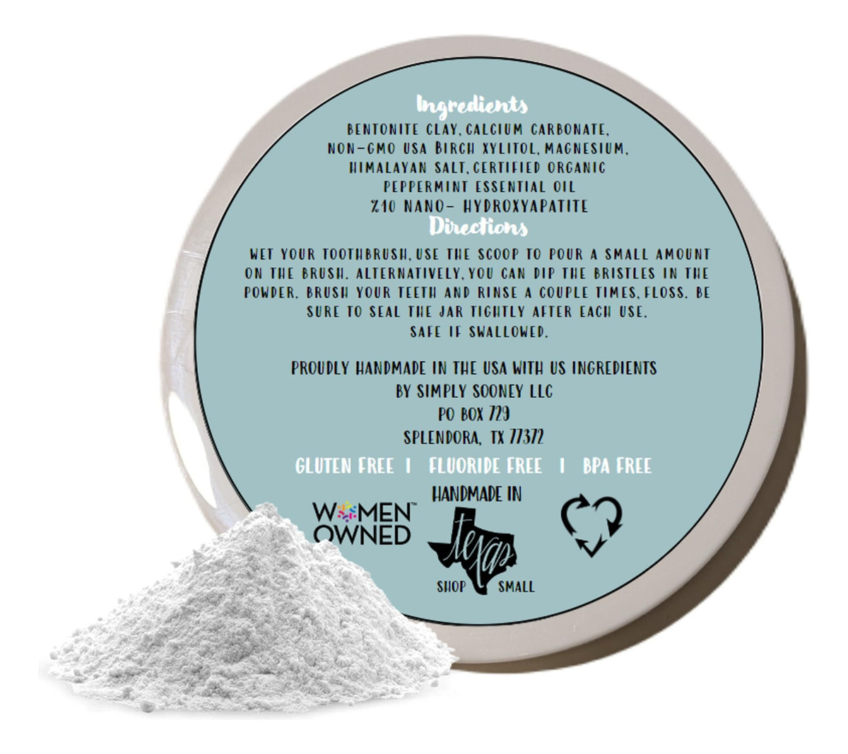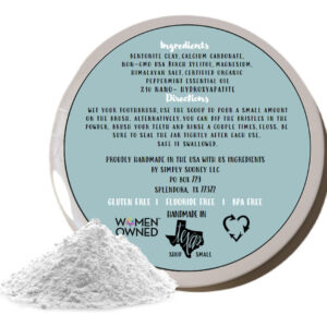 PÓ DENTAL REMINERALIZANTE ORGÂNICO SEM FLÚOR VEGANO VISÃO GERAL DO PRODUTO Pós dentais veganos feitos à mão em lotes ultrapequenos. Frasco de plástico âmbar sem BPA, de limpeza suave, não abrasivo, não tóxico, seguro quando ingerido. Feito com ingredientes orgânicos certificados provenientes de empresas americanas. Empresa de propriedade de uma mulher em atividade desde 2013. INSTRUÇÕES DE USO Molhe a escova de dentes Mergulhe a escova no pó Escove os dentes como faria normalmente Enxágue bem a boca Enxágue a escova de dentes e a pia Desfrute da sensação de limpeza fresca por doze horas ou mais! INGREDIENTES EM QUE VOCÊ CONFIA Argila bentonítica de qualidade alimentar Carbonato de cálcio puro de calcário, não cascas de ovo Xilitol de bétula americano não transgênico, magnésio puro, certificado com sal marinho do Himalaia, 10% Nano hidroxiapatita dos EUA – Feito à mão em pequenos lotes, usando produtos de empresas americanas. Os ingredientes são moídos em um pó aveludado e macio. – Força clinicamente comprovada: nossa flutuação pó dental sem oreto, enriquecido com hidroxiapatita, que foi clinicamente comprovado que fortalece, protege e restaura os dentes, além de promover bem-estar oral geral. – INGREDIENTES DE QUALIDADE: argila bentonita de qualidade alimentar, carbonato de cálcio vegano, xilitol de bétula não transgênico dos EUA, nano-hidroxiapatita dos EUA, magnésio, sal do Himalaia, óleo essencial de hortelã orgânico certificado, – FÁCIL DE USAR: basta mergulhar uma escova de dentes úmida no pó ou usar a colher de madeira fornecida. Escove os dentes como faria normalmente. Enxágue com água. Aproveite essa sensação de frescor e limpeza!