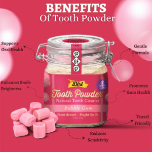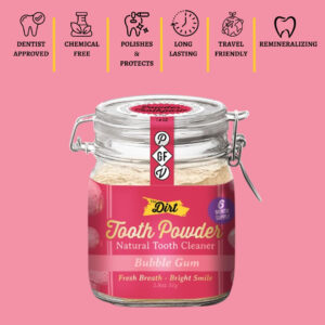 O pó de dente DIRT é a maneira perfeita de obter dentes limpos e frescos! Feito com ingredientes naturais, nosso pó dental é suave para os dentes e gengivas, mas eficaz na remoção de placas e bactérias. Além disso, os deliciosos sabores tornarão a escovação dos dentes uma experiência mais agradável. Nosso pó dental vem em seis sabores: Cinna Mint, Fennel Anise, Super Mint, Bubble Gum, Sweet Spice e Lemongrass & Ginger. Então, se você prefere um sabor clássico de menta ou algo um pouco mais exclusivo, temos um sabor para você. Para usar o THE DIRT Tooth Powder, basta molhar uma escova de dentes e mergulhá-la no pó. Em seguida, escove os dentes como faria normalmente. O pó espumará e criará uma pasta que limpará e refrescará os dentes. THE DIRT Tooth Powder é uma ótima opção para pessoas que procuram uma forma natural e eficaz de limpar os dentes. Também é perfeito para pessoas que estão em trânsito, pois é fácil de transportar e usar. – THE DIRT MINERAL TOOTH POWDER: Nosso pó vital para escovar dentes é uma alternativa autêntica e divertida à pasta de dente! Basta colocar uma escova de dentes úmida em um frasco de The Dirt e escovar normalmente para revelar dentes limpos e brancos. – LIMPA OS DENTES E REFRESCA O HÁLITO: Eleve sua rotina de higiene bucal com o refrescante pó dental The Dirts. Ele fornece uma explosão de frescor enquanto mantém seus dentes e gengivas saudáveis. Ilumine seu sorriso com nossa fórmula de clareamento dental, cuidadosamente feita à mão com propriedades refrescantes. – FÓRMULA DE CLAREAMENTO DENTAL: Feito com ingredientes essenciais como argila bentonita, bicarbonato de sódio e óleos essenciais, nosso pó dental proporciona uma sensação de frescor e limpeza que dura o dia todo e promove a higiene bucal e o hálito fresco. – NATURAL, SEM GLÚTEN E FLÚOR: Livre de flúor, SLS, parabenos e glicerina, o O pó dental Dirts oferece uma opção sem glúten para quem busca um produto de higiene bucal limpo e saudável. Ótimo para pessoas sensíveis ao milho, soja ou glúten. Use com nosso raspador de língua e enxaguante bucal para obter os melhores benefícios! – PARA DENTES SENSÍVEIS: Especialmente formulado para dentes sensíveis, nosso pó para dentes sensíveis, seguro de esmalte, limpa e protege suavemente seus dentes. Com os benefícios adicionais do controle do tártaro, este pó de higiene bucal garante uma boca limpa e saudável. Diga adeus à sensibilidade com o pó dental eficaz e refrescante The Dirts. – MISTURA DE ÓLEOS ESSENCIAIS E ERVAS: Uma deliciosa mistura de argila, ervas e óleos essenciais limpa os dentes sem produtos químicos agressivos ou sabores artificiais, torna nosso pó dental orgânico. Ervas ricas em antioxidantes ajudam a combater os danos celulares, os óleos essenciais de grau terapêutico combatem os germes e removem a placa bacteriana e o tártaro, enquanto a argila bentonítica se desaloja suavemente nas manchas e dá brilho ao sorriso.