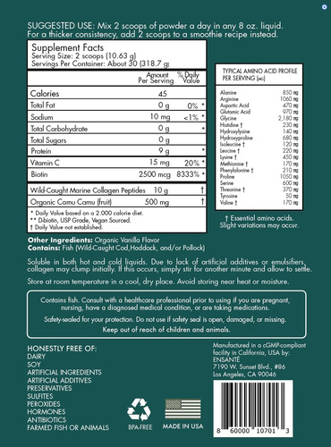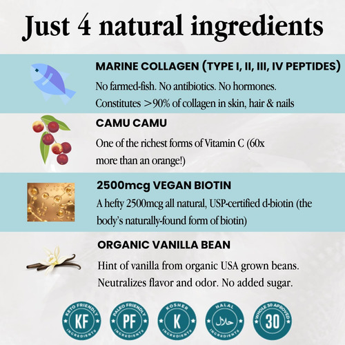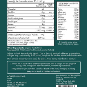 • Fórmula orgânica baseada em alimentos integrais, clinicamente respaldada —- Nossa fórmula de peptídeos de colágeno hidrolisado é feita com ingredientes 100% naturais e orgânicos à base de alimentos integrais. Nosso pó de colágeno marinho é feito de peixes do Atlântico Norte NÃO OGM capturados na natureza. Nosso pó de proteína de colágeno é altamente biodisponível, digerível e mistura-se facilmente. Formulamos o melhor colágeno para mulheres e homens com vitamina C da fruta camu camu orgânica + biotina natural para o crescimento natural do cabelo e extrasimpulso de beleza.