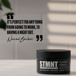 Pomada clássica STMNT Grooming Goods, 3,38 onças | Brilho natural | Controle forte | Fácil de lavar — Oferece forte controle com brilho natural. Suporte flexível sem grudar. – Pomada à base de água. Lava-se facilmente. – Nomad Barbers Signature Fragrance Spices Lavender e um toque de madeira – Esfregue uma pequena quantidade entre as palmas das mãos e aplique uniformemente nos cabelos úmidos ou secos. Pode ser reativado com água.