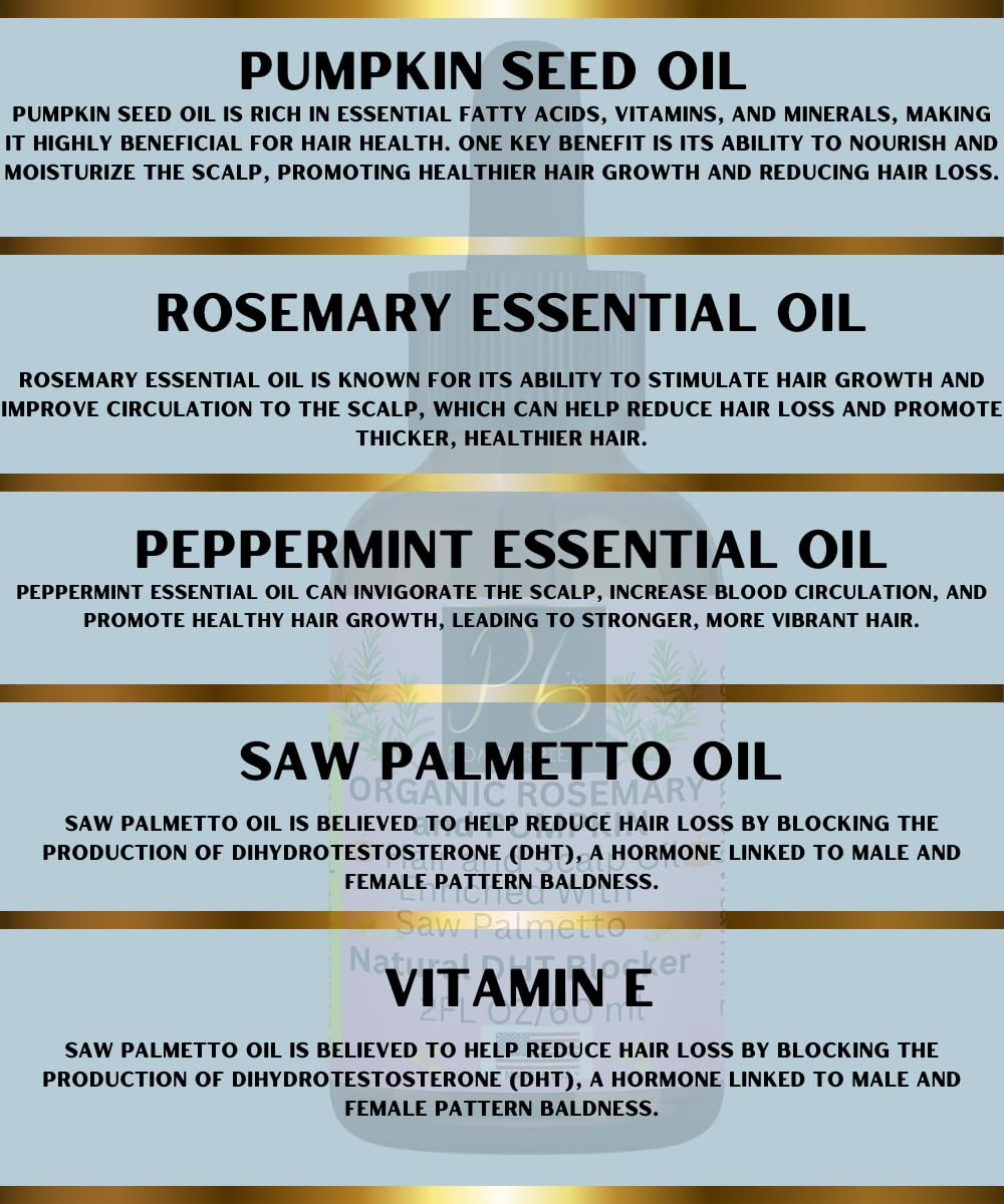 Apresentamos nossa mistura de óleos capilares orgânicos, uma fórmula cuidadosamente elaborada, enriquecida com ingredientes premium para cabelos mais saudáveis e brilhantes. Esta mistura contém óleo essencial de alecrim orgânico e óleo essencial de hortelã orgânico para revigorar e estimular o couro cabeludo, promovendo o crescimento do cabelo. Combinada com óleo de semente de abóbora orgânico prensado a frio, óleo de saw palmetto e vitamina E, essa mistura única nutre e fortalece o cabelo da raiz às pontas. Experimente os benefícios revitalizantes dos melhores ingredientes da natureza em uma garrafa. Eleve sua rotina de cuidados com o cabelo com nossa mistura de óleos orgânicos para cabelos lindos e radiantes. Adequado para todos os tipos de cabelo. – Alecrim revitalizante: o óleo essencial de alecrim orgânico estimula a circulação do couro cabeludo, promovendo o crescimento do cabelo e a saúde geral do couro cabeludo. – Semente de abóbora rica em nutrientes: o óleo de semente de abóbora orgânico fornece uma fonte rica em ácidos graxos e nutrientes essenciais, nutrindo os fios de cabelo para aumentar a força e a vitalidade. – Hortelã revigorante: o aroma refrescante do óleo essencial de hortelã orgânico não apenas aviva os sentidos, mas também adiciona um toque rejuvenescedor, promovendo um ambiente de couro cabeludo limpo e revigorado. — Suporte de Saw Palmetto: Enriquecida com óleo de palmeira, conhecido por seus benefícios potenciais no apoio à saúde do cabelo, essa mistura contribui para uma abordagem holística para manter os fios fortes e resilientes. – Defesa antioxidante com vitamina E: fortificada com vitamina E, essa mistura oferece proteção antioxidante, protegendo os cabelos dos estressores ambientais e promovendo uma aparência saudável e radiante.