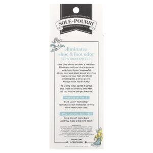 Dê aos seus calçados e pés um descanso! Eliminar a sensação de humor (não mascará-la) com as poderosas enzimas à base de frutas cítricas, menta e plantas da Sole~Pourri que deixam seus pés e pés com um cheiro agradável como um pomar de frutas cítricas. Sempre fresco. Nunca funky.