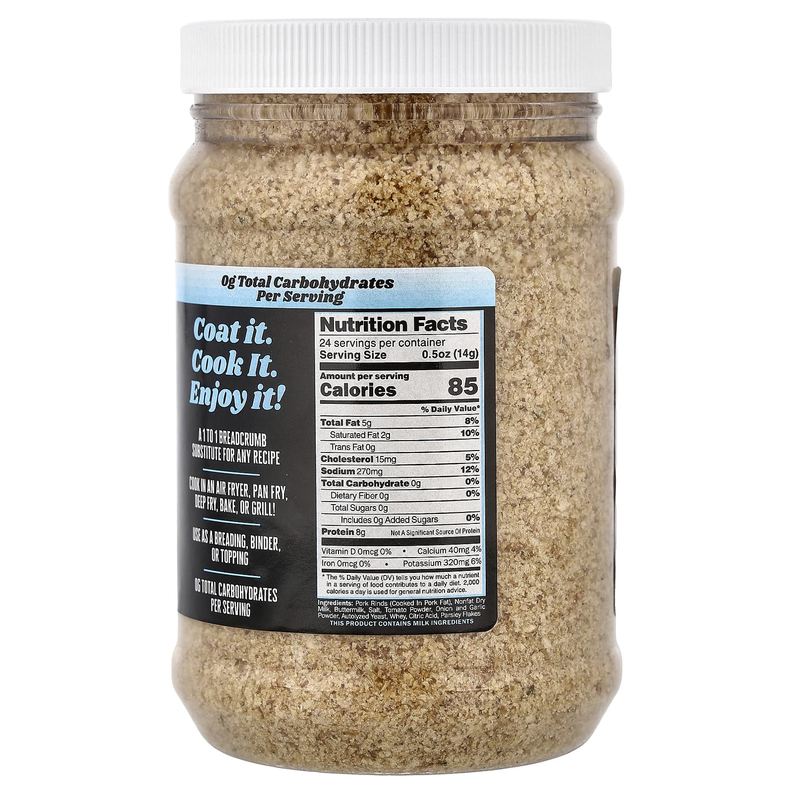 Um substituto de 1 a 1 pão ralado para qualquer receita. Cozinhe em uma frigideira de ar, frite, leve ao forno ou grelha. Use como empanamento, aglutinante ou cobertura.