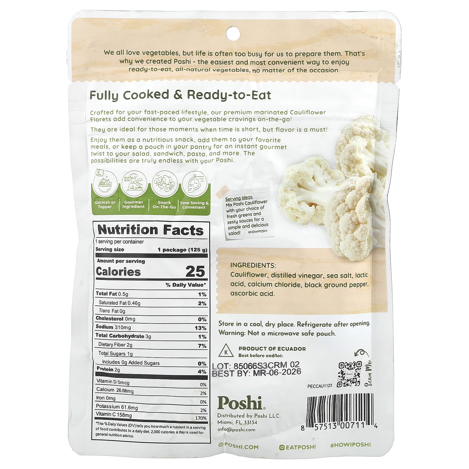 Poshi Easy Chef Couve-Flor com Sal e Pimenta-do-Reino 125 g (44 oz) – Poshi Alimentos Alimentos embalados e prontos Refeições Prontas.