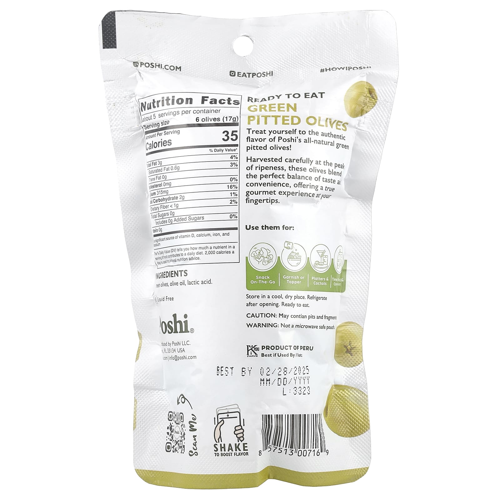 Poshi Snacks Azeitonas Verdes Premium Original 85 g (3 oz) – Poshi Alimentos Condimentos, molhos e pastas Azeitonas Petiscos e lanches Snacks de frutas e vegetais.