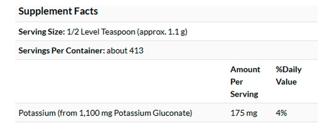 5. Composição Nutricional Eficiente: Cada porção contém uma quantidade concentrada de Potássio Gluconato, em um recipiente de 454 gramas, oferecendo uma opção de longa duração e eficaz para suprir as necessidades desse mineral. Validade longa