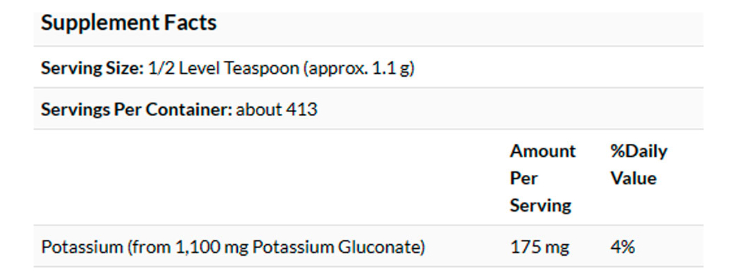 5. Composição Nutricional Eficiente: Cada porção contém uma quantidade concentrada de Potássio Gluconato, em um recipiente de 454 gramas, oferecendo uma opção de longa duração e eficaz para suprir as necessidades desse mineral. Validade longa