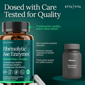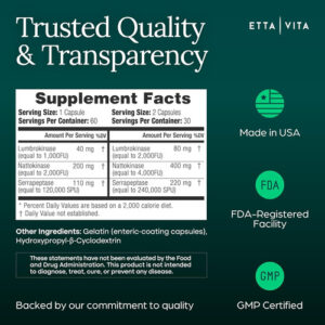 • [Poderoso Complexo de Enzimas Digestivas] A mistura eficaz dos suplementos de lumbroquinase Etta Vitas contém as enzimas Natto, Serrapaptase e Lumbroquinase que são poderosas e podem apoiar a desintoxicação saudável, saúde intestinal, suporte articular, fluxo e circulação, reparação de tecidos danificados, gerenciamento de energia e suporte cognitivo.