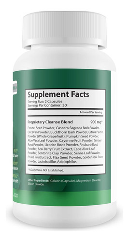 erva-doce, pó de casca de cáscara Sagrada, Pó de farelo de aveia, pó de casca de espinheiro, pectina cítrica em pó, pó de semente de abóbora, pó de folha de aloe vera, pó de pimenta caiena, pó de raiz de gengibre, açaí Extrato, pó de folha de aloe de cabo, pó de argila bentonita, pó de folha de senna, extrato de ameixa seca, pó de linhaça, pó de raiz de goldenseal, Lactobacillus acidophilus