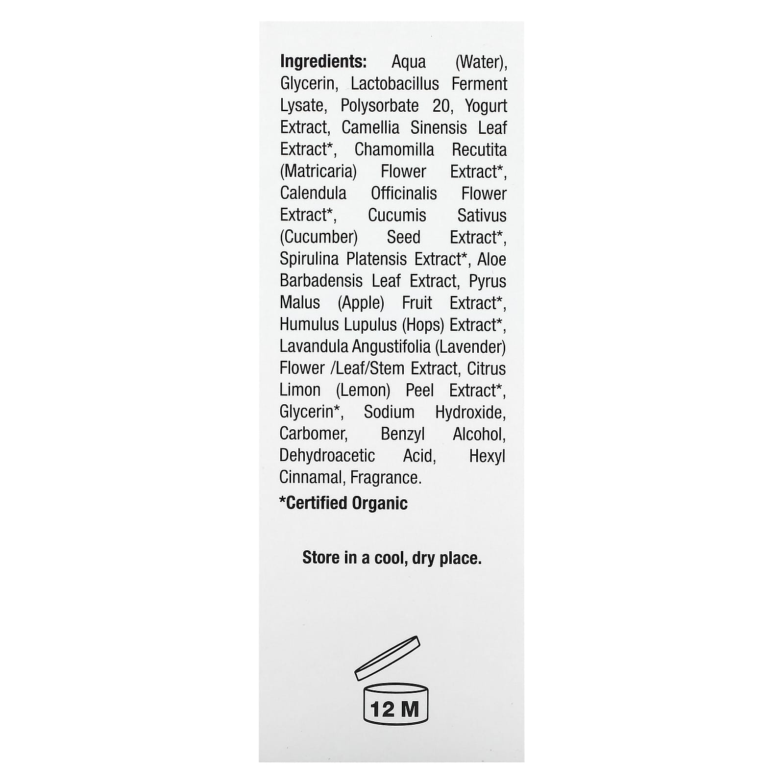 Aqua (Água), Glicerina, Lisado de Fermento de Lactobacillus, Polissorbato 20, Extrato de Iogurte, Extrato da Folha de Camellia sinensis*, Extrato da Flor de Chamomilla recutita (Matricária)*, Extrato da Flor de Calendula officinalis*, Extrato da Semente de Cucumis sativus (Pepino)*, Extrato de Spirulina platensis*, Extrato da Folha de Aloe Barbadensis, Extrato da Fruta de Pyrus malus (Maçã)*, Extrato de Humulus lupulus (Lúpulo)*, Extrato da Flor/Folha/Caule de Lavandula angustifolia (Lavanda), Extrato da Casca de Citrus limon (Limão)*, Glicerina*, Hidróxido de Sódio, Carbômer, Álcool Benzílico, Dehydroacetic Acid, Hexyl Cinnamal, Fragrância.