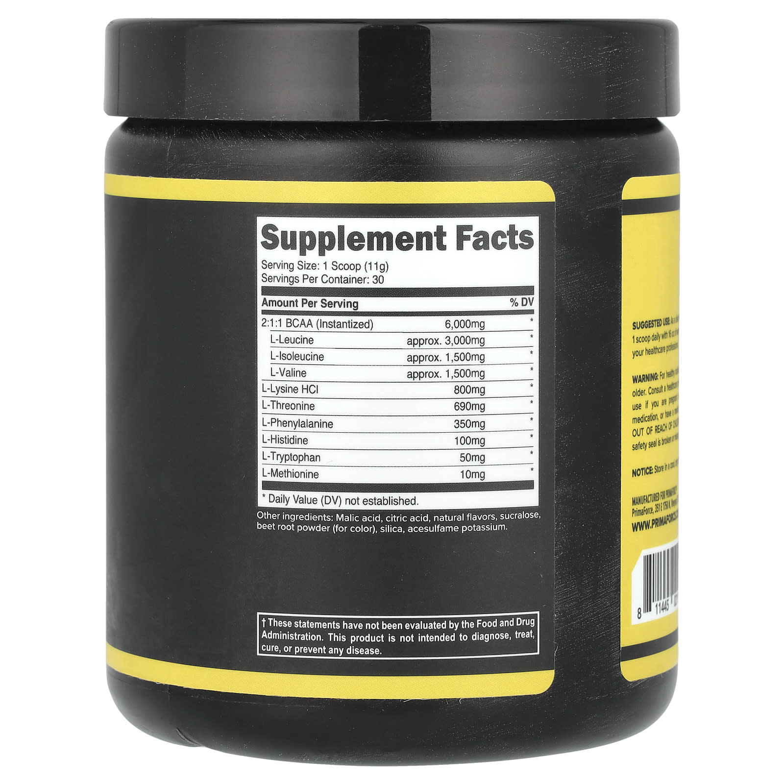 O EAA em pó PrimaForce tem 8 gramas de EAAs por dose e 30 porções por recipiente.