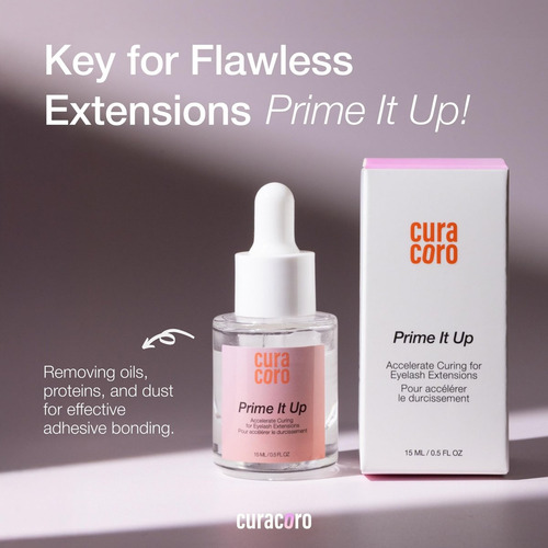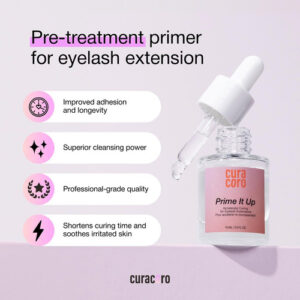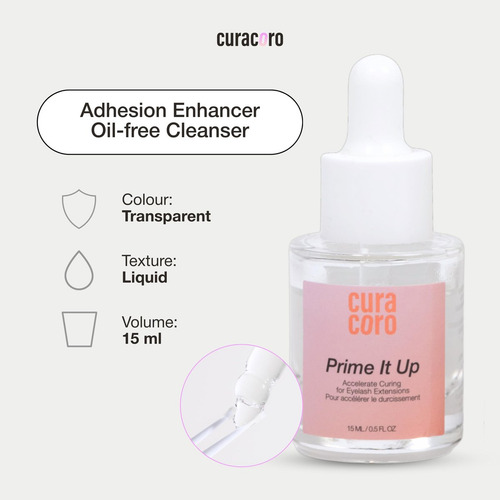 Curacoro PRIME IT UP é um primer profissional com qualidade de salão, confiado por técnicos certificados de extensão de cílios no Canadá e no Brasil. Formulado com ingredientes premium, veganos e livres de crueldade, foi projetado exclusivamente para uso profissional e não para uso individual ou doméstico. Melhora a adesão entre cílios e extensões naturais, garantindo maior durabilidade da cola e resultados mais duradouros. Sua fórmula profunda e com pH balanceado remove com eficácia óleos, proteínas e resíduos de maquiagem após o banho dos cílios, preparando os cílios de maneira ideal para aplicação. Também é suave e pouco irritante, com um aroma cítrico refrescante que oferece uma experiência limpa e agradável para o cliente. Ideal para profissionais que buscam maximizar a retenção e a saúde das extensões de cílios.