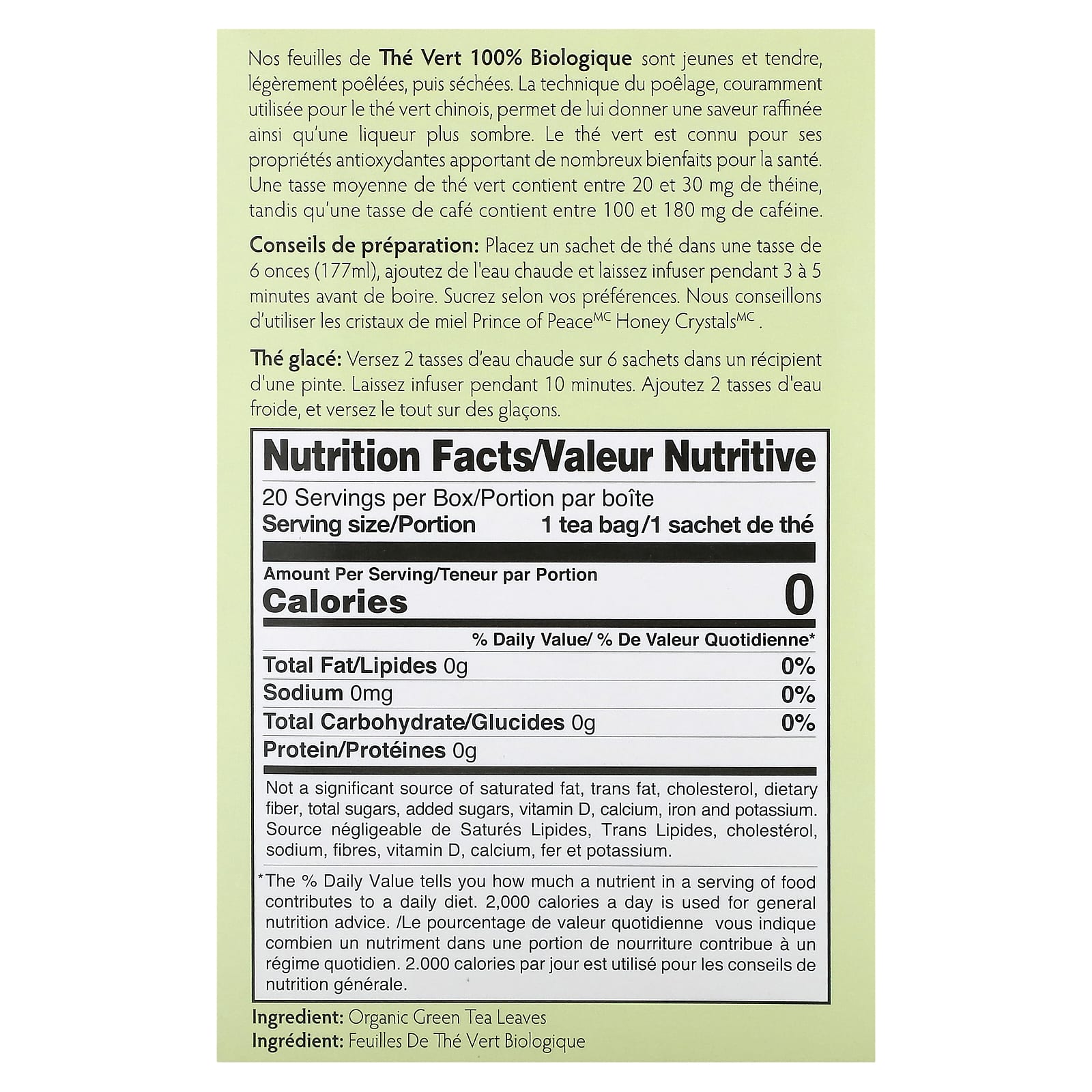 Coloque um saquinho de chá em uma embalagem de 6 fl. copo de 177 ml (oz.), adicione água quente e deixe em infusão por 3 a 5 minutos antes de beber. Adoce a gosto. Recomendamos os cristais de mel Prince of Peace®.