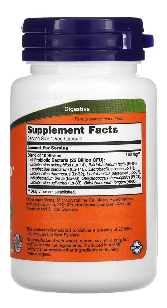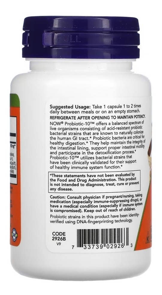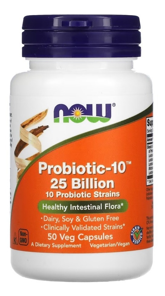 Probiótico10 25 Bilhões UFC Now Foods 50Veg caps As bactérias probióticas desempenham uma série de funções importantes para o organismo, especialmente para o trato digestivo, porém, não são encontrados em uma grande variedade de alimentos. As cepas bacterianas são fundamentais para uma digestão equilibrada, ajudam a manter a integridade do revestimento intestinal, suportam a motilidade intestinal adequada e participam do processo de desintoxicação. A suplementação é uma ótima maneira de garantir que você está fornecendo ao seu corpo um espectro equilibrado de organismos vivos que consistem em cepas de bactérias probióticas resistentes a ácido que são conhecidas por colonizar naturalmente o trato gastrointestinal humano. Ingredientes: Celulose em pó, celulose (cápsula), FOS (fructo-oligossacarídeos), ascorbil palmitato e sílica. Sem trigo, glúten, soja, leite, ovo, peixe, crustáceos ou ingredientes de nozes. Recomendações de uso: Tomar de 1 a 2 vezes ao dia. Cuidados: Se estiver grávida ou amamentando, busque orientação antes de usar este produto. Refrigerar após a abertura para manter a potência. Mantenha fora do alcance das crianças. Instruções de armazenamento: Pode ocorrer variação natural de cor neste produto. Conteúdo do Frasco. 50 Veg Caps Vegetarianas