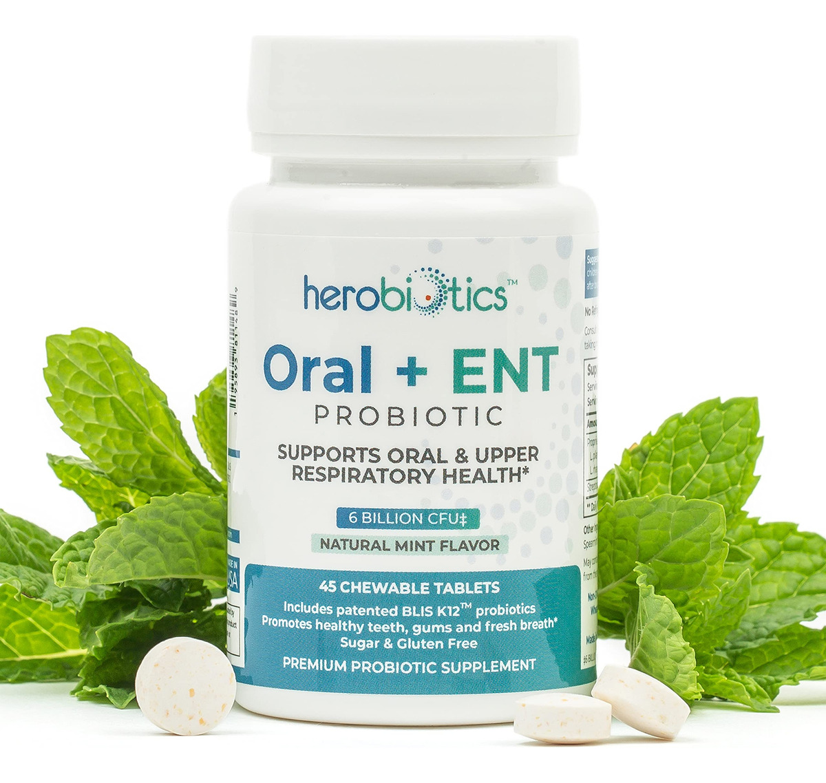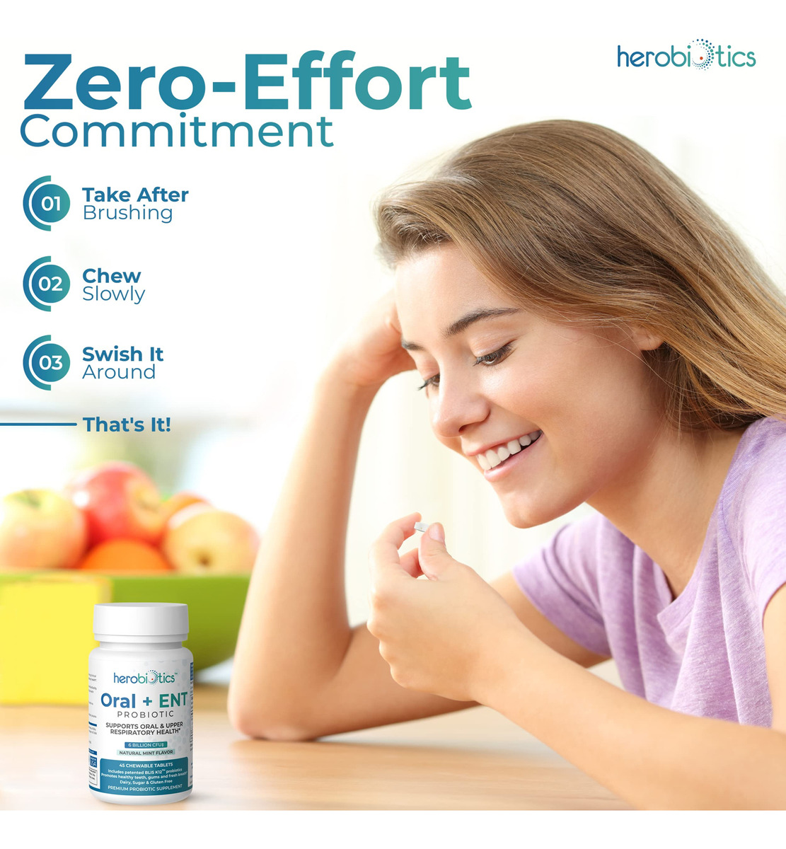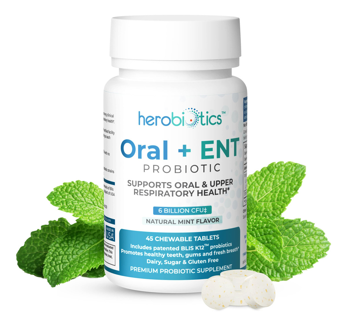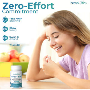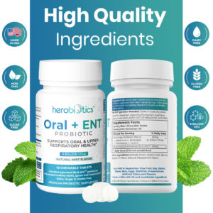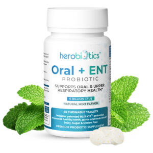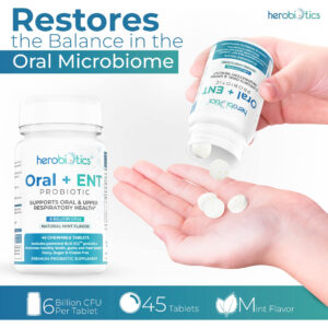 suplementos probióticos Herobiotics Oral + ENT são: Mastigáveis e seguros para adultos e crianças Formulados para apoiar a saúde intestinal Projetado para promover a boa saúde bucal e acabar com o mau hálito Capaz de fornecer apoio aos pais cujos filhos não escovam os dentes Projetado para melhorar a saúde respiratória superior