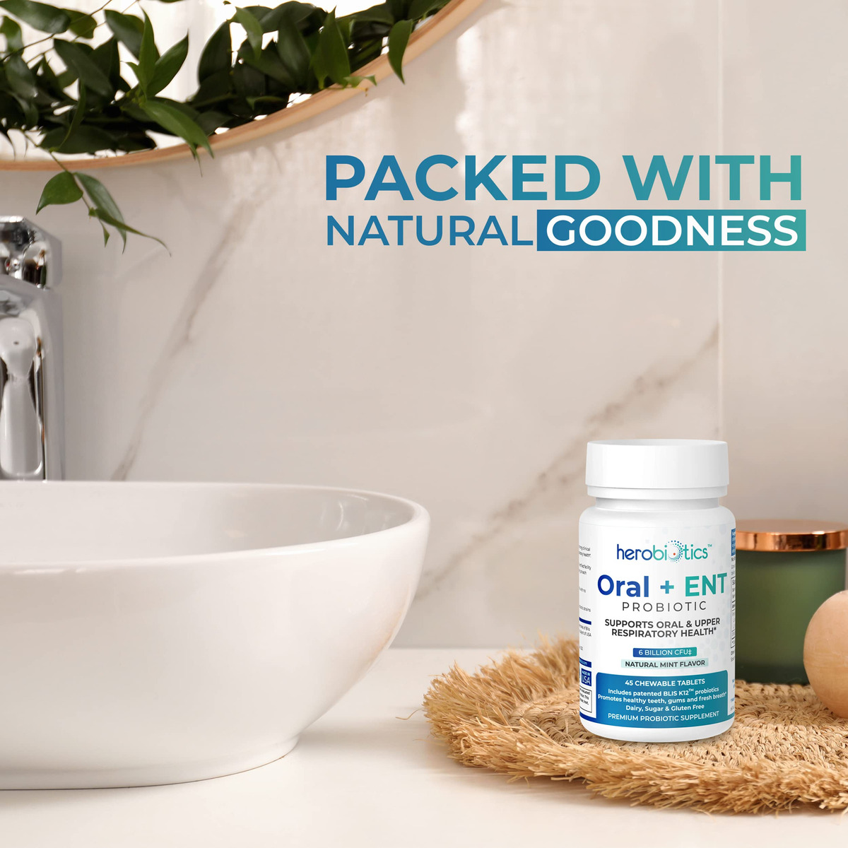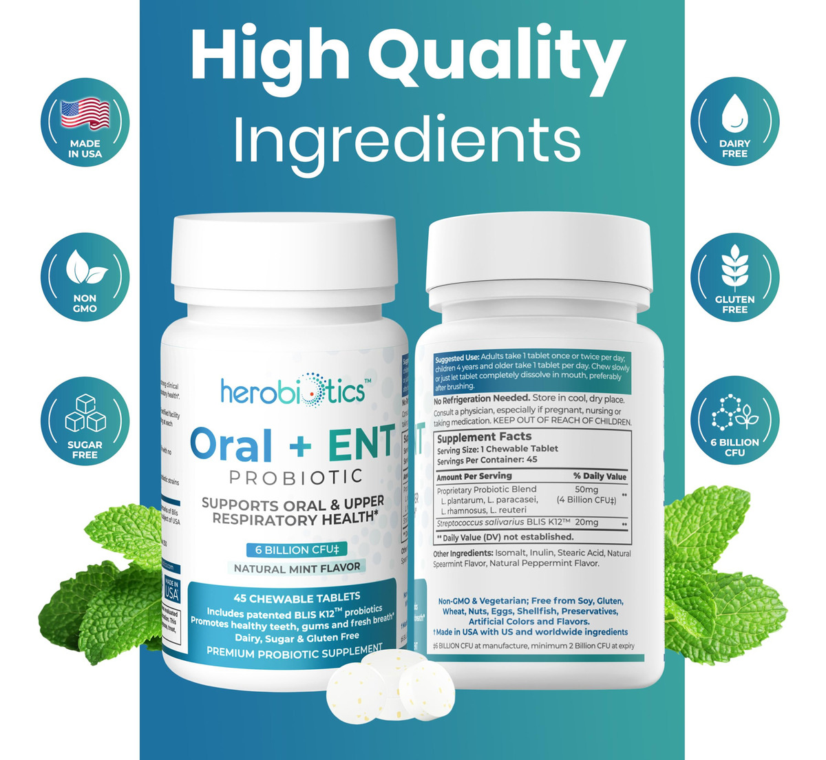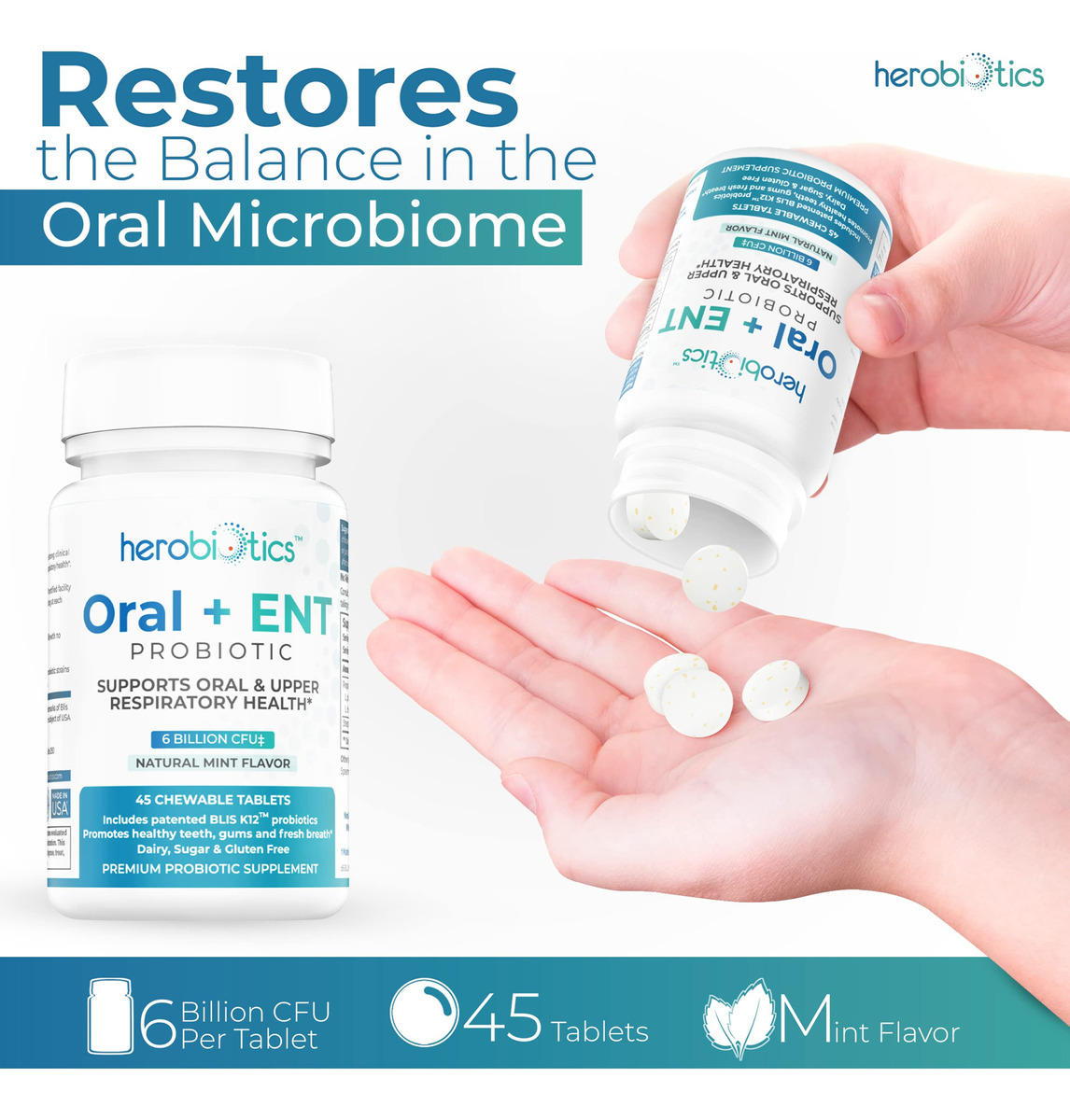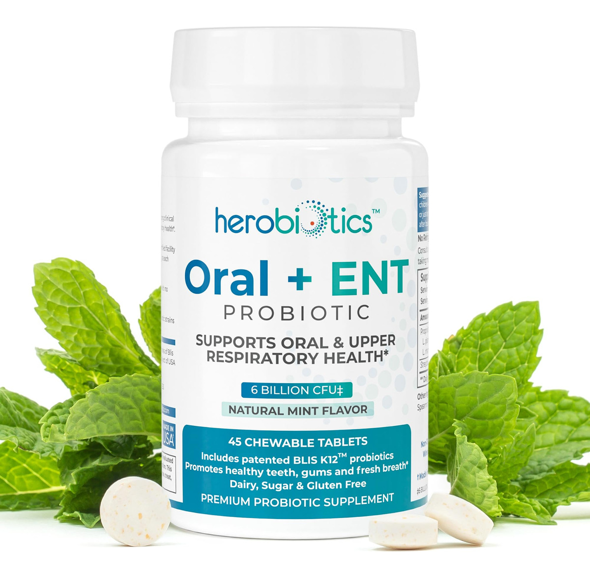 suplementos probióticos Herobiotics Oral + ENT são: Mastigáveis e seguros para adultos e crianças Formulados para apoiar a saúde intestinal Projetado para promover a boa saúde bucal e acabar com o mau hálito Capaz de fornecer apoio aos pais cujos filhos não escovam os dentes Projetado para melhorar a saúde respiratória superior