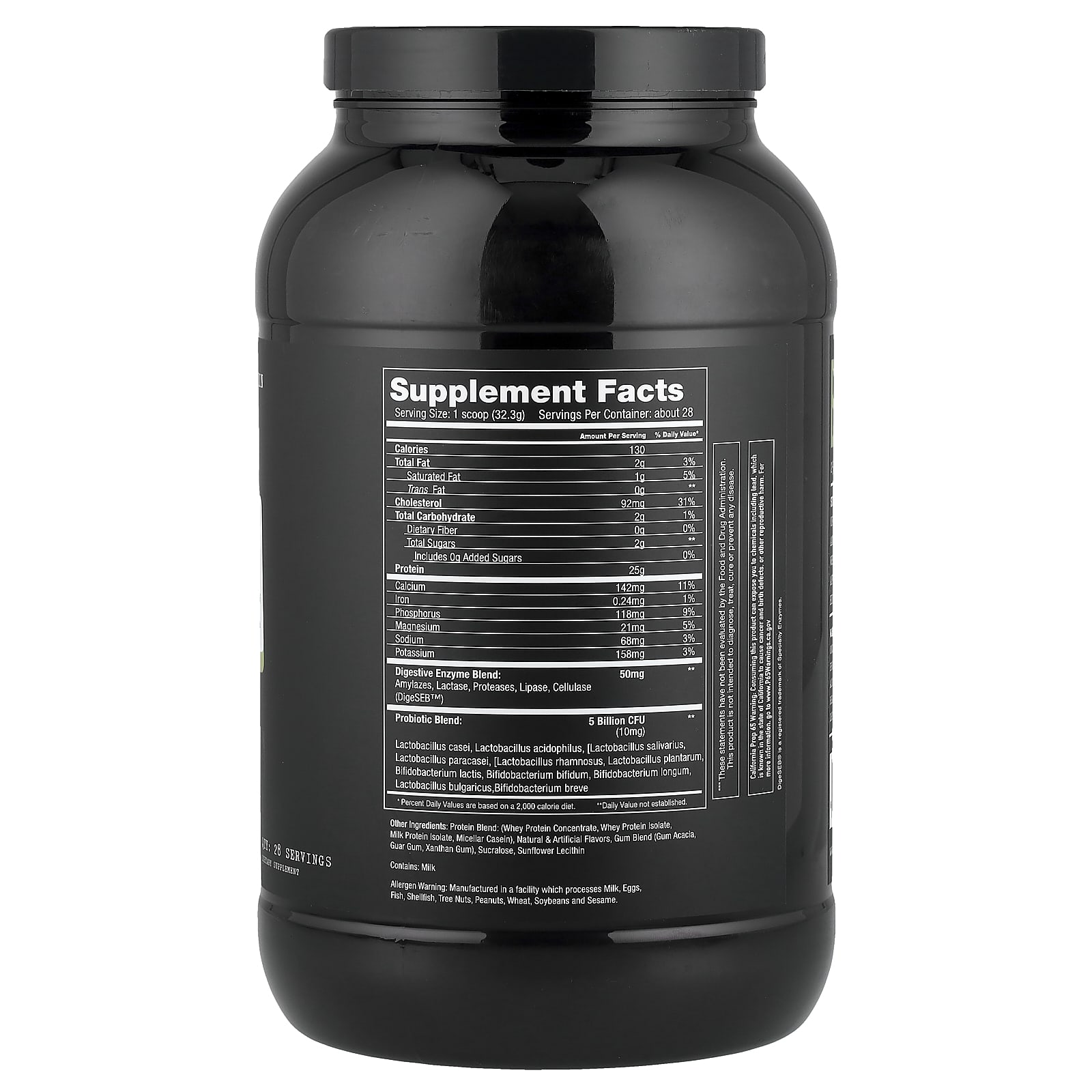 Mistura de Proteínas: (concentrado de proteína whey, isolado de whey protein, isolado proteico de leite, caseína micelar), sabores naturais e artificiais, mistura de gomas (goma de acácia, goma guar, goma xantana), sucralose, lecitina de girassol.