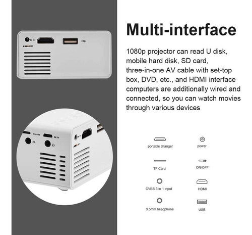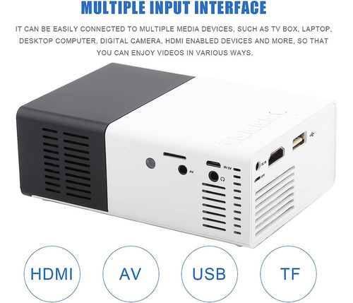 polegadas 5. O miniprojetor USB de alta eficiência alimentado por USB é alimentado por um adaptador de energia (sem bateria embutida) ou pode ser alimentado por um carregador de celular, carregador de carro ou banco de energia por meio da interface micro-USB (precisa suportar 5V/2,5A), aproveite a qualquer hora, em qualquer lugar.