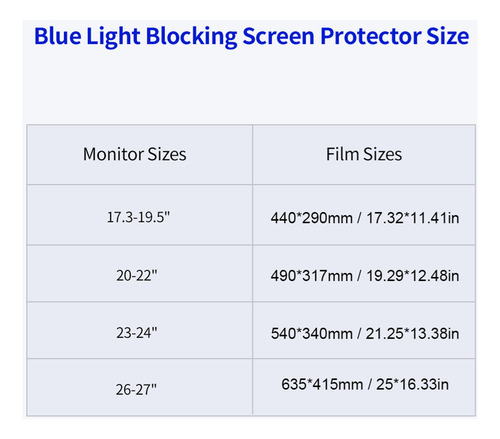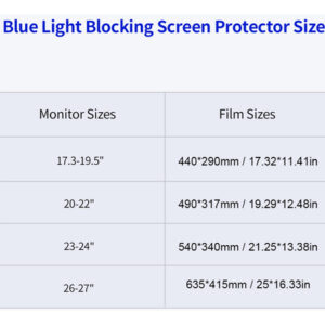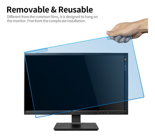 Protetor de tela suspenso com bloqueio de luz azul Película de proteção ocular anti-UV de alta transmitância para monitor de mesa de 26-27 Característica: Por que você precisa disso? Se você sofre de olhos secos, fadiga ocular, redução da melatonina, radiação ultravioleta, sardas, rugas ou miopia, precisa de um filme bloqueador de luz azul para protegê-lo. A necessidade disso Temos que usar o computador por um longo tempo, enquanto a córnea e o cristalino de nossos olhos são incapazes de resistir ou refletir a luz azul. Removível u0026 Reutilizável. Diferente dos filmes comuns, ele foi projetado para ser pendurado no monitor. Portanto, é útil se você tiver vários monitores. Alta transmitância. Com esse design, ele restaura as cores que a tela exibe, na medida do possível.Protetor de tela. Com este filme, a tela é mantida longe de gordura, impressões digitais e suor. Além disso, o filme é lavável.