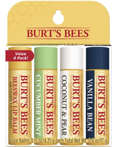 Meias de protetor labial Burt's Bees, presentes de Natal hidratantes para cuidados labiais, sorvete doce — cera de abelha original, hortelã de pepino, coco e pera, baunilha, tratamento de origem natural (pacote com 4) — Bálsamo labial saboroso: um pacote contém quatro tubos de protetor labial de 0,15 onças de protetor labial Burts Bees nos sabores de cera de abelha, hortelã, coco e pêra para hidratar e suavizar seus lábios – LÁBIOS HIDRATADOS: Cada bálsamo é infundido com cera de abelha de origem responsável, óleos nutritivos e manteiga para um tratamento labial condicionador que mantém seus lábios felizes, saudáveis e suculentos – QUATRO SABORES REFRESCANTES: deleite os sentidos com os sabores de cera de abelha, pepino, hortelã, coco e pera e baunilha que o incentivarão a aplicar protetor labial aromatizado repetidamente – NUTRA OS LÁBIOS SECOS OU RACHADOS: O tubo de protetor labial hidratante sem tinta desliza suavemente sobre seus lábios para nutri-los, mantendo-os felizes, saudáveis e hidratados – TERAPIA LABIAL CONDICIONANTE: Este hidratante labial deixa seus lábios felizes, saudáveis e hidratados lábios suaves e refrescados com um acabamento fosco de ingredientes naturais – ORIGEM NATURAL: Formulado sem parabenos, ftalatos, petrolato ou SLS, é 100% protetor labial natural revitaliza e embeleza seus lábios com ingredientes limpos para hidratar sem preocupações – Cuidado labial à mão: fácil de colocar no bolso ou guardar na bolsa, este protetor labial natural é perfeito para o verão, inverno, outono e primavera – Complete o conjunto: não se esqueça dos ótimos produtos da Burts Bees, incluindo uma grande variedade de cremes, loções e muito mais; é fácil criar uma rotina completa de cuidados com a pele com estes produtos acessíveis – Nº 1 RECOMENDADO: Burts Bees é a marca número 1 de cuidados naturais para a pele recomendada por dermatologistas (1) (1) Com base em setembro de 2021 Pesquisa nacional NielsenIQ de dermatologistas dos Brasil