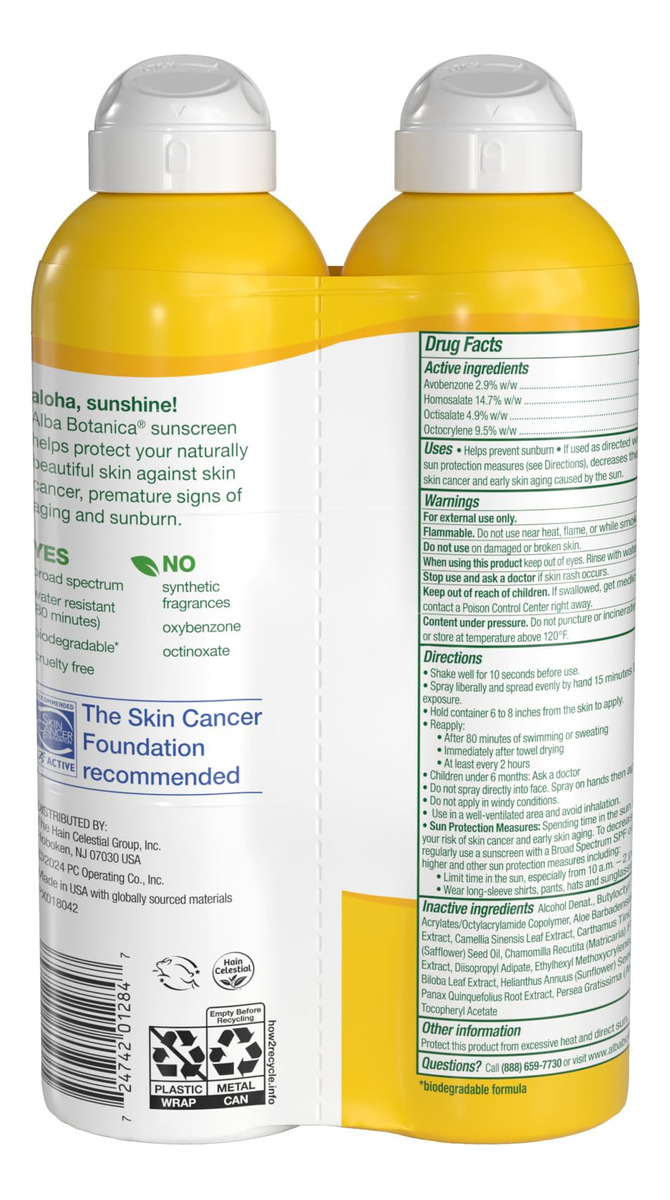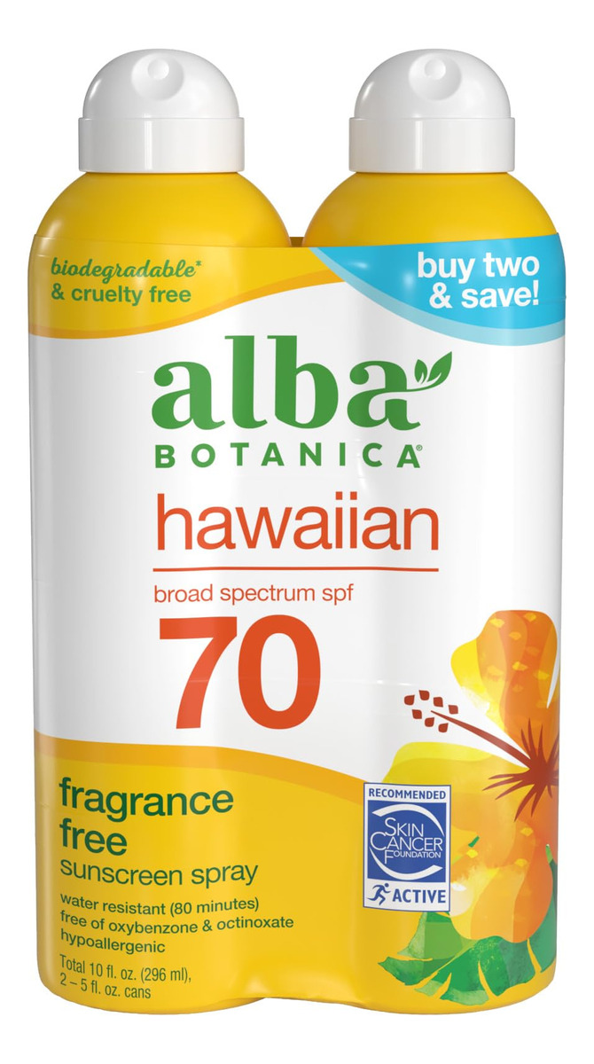 Protetor solar de coco havaiano Alba Botanica, protetor solar em spray de amplo espectro SPF 70, frasco de 5 fl oz e resistente à água (pacote com 2) – PROTEÇÃO SOLAR SPF 70: recomendado pela Skin Cancer Foundation, esse protetor solar biodegradável de amplo espectro ajuda a proteger a pele dos nocivos raios UV – ESSENCIAL PARA A PRAIA: Feito com ingredientes e vegetais 100% vegetarianos, nossa fórmula biodegradável com SPF 70 oferece proteção solar que sua pele vai adorar – PROTETOR SOLAR SEM PERFUME: um spray protetor solar leve e de secagem rápida com ingredientes como aloe vera e cártamo óleo, óleo de abacate e extrato de camomila – DESCUBRA O CUIDADO SOLAR ALBA BOTANICA: desenvolva sua coleção de protetores solares com a linha completa de sprays de proteção solar, loções de proteção solar, protetores solares à base de minerais e produtos pós-sol da Alba Botanica – SPRAY PROTETOR SOLAR HAVAIANO: inclui dois frascos de 5 fl. oz de spray protetor solar sem perfume havaiano, SPF 70 com spray aprimorado