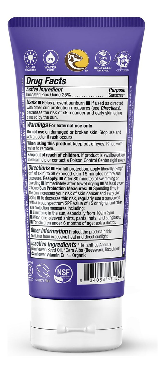 Nutra e proteja sua pele com este creme protetor solar mineral que oferece 80 minutos de resistência à água por longos dias no surf e no sol. Feita com 4 ingredientes simples, essa fórmula sem água e rica em antioxidantes também é uma das primeiras a obter a rigorosa certificação Protect Land + Sea, que não agride recifes, *. Ingredientes sem perfume, hipoalergênicos e 98% orgânicos. *Os produtos rotulados com o selo de certificação – Protect Land + Sea – significam que o produto foi testado de forma independente pelo Laboratório Ambiental Haereticus (HEL) para verificar se o produto NÃO contém substâncias químicas conhecidas como poluentes em muitos ambientes diferentes (riachos de água doce, rios, praias e sistemas oceânicos) ou vida selvagem (corais, peixes, pássaros, mamíferos marinhos, tartarugas marinhas). Lista completa de ingredientes: óxido de zinco transparente não revestido, óleo de girassol orgânico, cera de abelha orgânica, vitamina E de girassol (98% orgânica e certificada como não transgênica) – SEGURO E EFICAZ: ajude a prevenir queimaduras solares e danos à pele com protetor solar mineral de óxido de zinco com proteção UVA/UVB de amplo espectro. Hipoalergênico e não comedogênico, é suave para peles sensíveis. – INGREDIENTES NATURAIS: Feita com apenas 4 ingredientes que hidratam e nutrem, esta loção protetora solar para todo o corpo oferece proteção solar 100% óxido de zinco. Sem glúten e sem OGM. — FÁCIL DE USAR: A fórmula leve à base de girassol é fácil de aplicar no rosto e no corpo. 80 minutos de resistência à água significam que você fica protegido enquanto se diverte ao sol. Perfeito para viagens, praia e surfe. – PROTETOR SOLAR SEGURO PARA RECIFES: Livre de oxibenzona e outros produtos químicos que prejudicam os recifes de coral. Protetor solar biodegradável para viagens aprovado pelo México e Havaí. Seguro para recifes significa seguro para você. – SUSTENTÁVEL: os protetores solares minerais Badger não têm ingredientes sintéticos, são livres de crueldade e vêm em tubos 50% reciclados. Feito com 100% de energia solar nos EUA por uma empresa familiar de propriedade de mulheres.