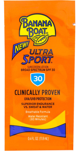 Loção protetora solar Banana Boat Ultra Sport SPF 30 – 0,4 fl. oz. (11,8 mL) 200 pacotes Mantenha-se protegido dos raios fortes do sol com a loção protetora solar Banana Boat Ultra Sport SPF 30. Este protetor solar clinicamente comprovado oferece proteção UVA/UVB de amplo espectro, ajudando a prevenir queimaduras solares e danos à pele a longo prazo. Sua fórmula de resistência superior foi projetada para funcionar contra o suor e a água, tornando-a ideal para atividades ao ar livre e esportes. A fórmula respirável garante um uso confortável, enquanto suas propriedades resistentes à água fornecem até 80 minutos de proteção antes que a reaplicação seja necessária. O prático pacote de uso único de 11,8 ml (0,4 fl. oz.) o torna perfeito para viagens, bolsas esportivas ou uso em qualquer lugar. Mantenha-se protegido e ativo com a loção protetora solar Banana Boat Ultra Sport SPF 30, sua defesa ideal contra o sol!