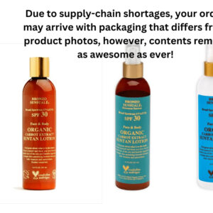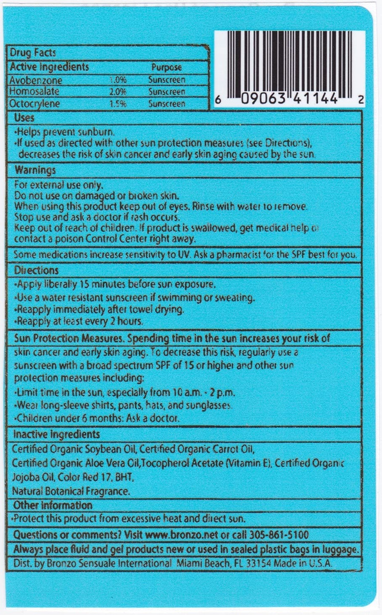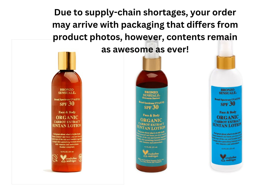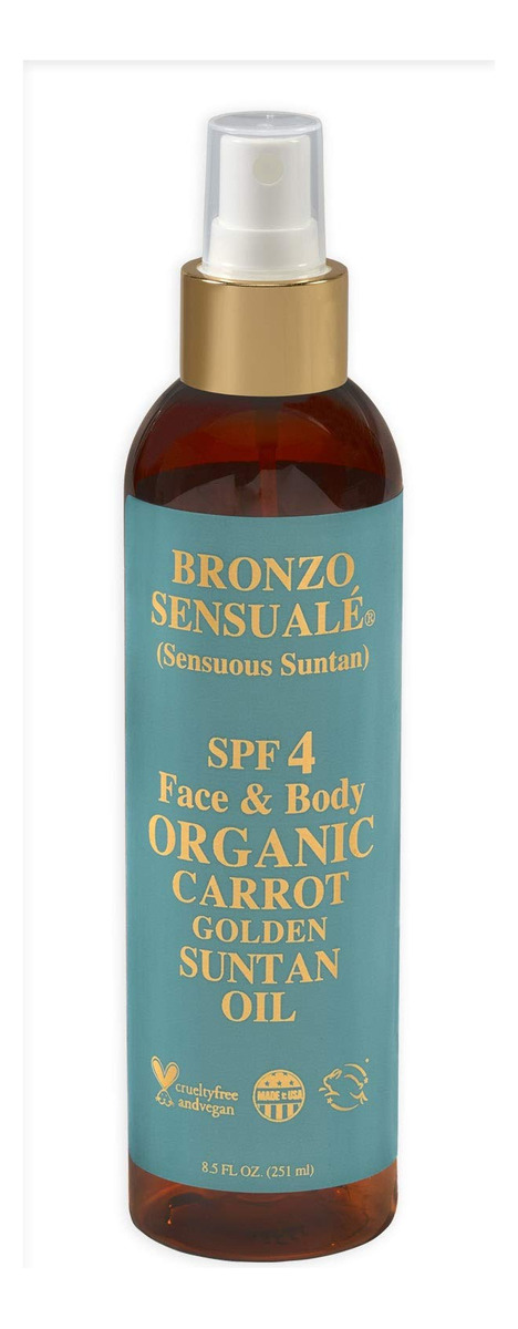 Os produtos exclusivos Bronzo Sensuale (Sensuous Suntan) ajudam a criar um bronzeado profundo e saudável (não é autobronzeador nem bronzeador). Contém ingredientes orgânicos, naturais e botânicos, como: cenoura, gel de aloe vera, manteiga de karité, além de vitaminas A, E e antioxidantes que adoram a pele. Produzido em pequenos lotes para garantir qualidade, frescor e obter o máximo em valor nutritivo antienvelhecimento e antirrugas para sua pele. Os óleos bronzeadores dourados com fórmula de cenoura Bronzo Sensuale são ideais para o rosto e para todo o corpo. – Sem octinoxato, sem óleo mineral, sem oxibenzona, sem petróleo, sem parabenos – NÃO SEM PERFUME. Apresentando nosso famoso perfume de aromaterapia para aliviar o estresse.